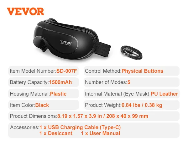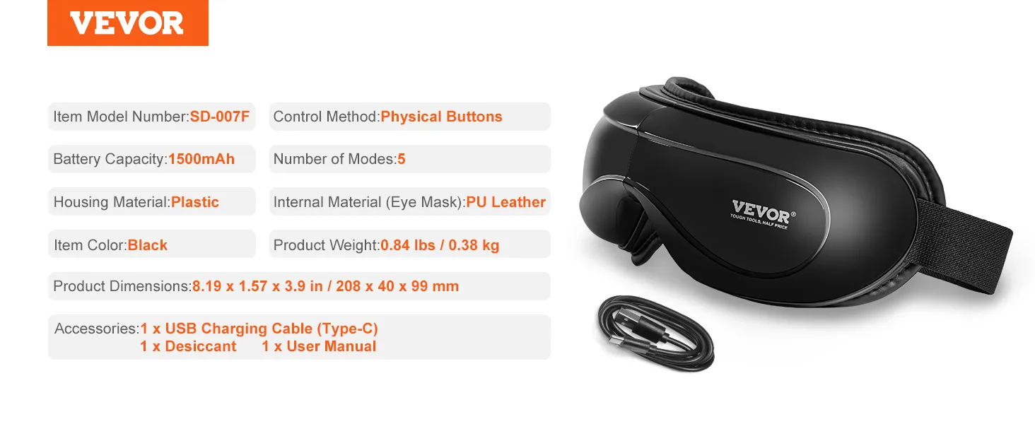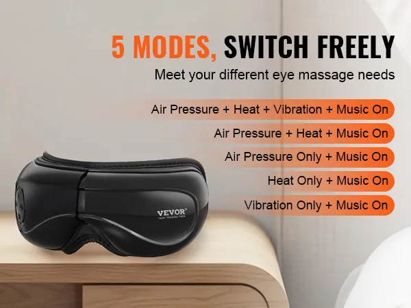 Experience personalized and soothing eye care with VEVOR eye massager. Enjoy 104°-107℉ heating therapy to alleviate fatigue, plus 5 massage modes for tailored comfort. Bluetooth connectivity and built-in white noise offer an immersive music experience. Eyes revived, stress relieved.