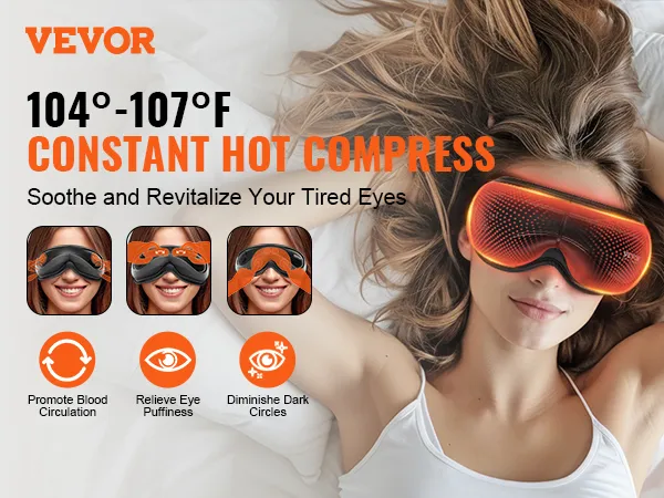 Heated Eye Massage: Enjoy soothing relief with VEVOR eye massager's built-in heating pad, delivering comfortable heating therapy at 104℉-107℉. Effectively alleviates eye fatigue, puffiness, and dryness, and helps reduce dark circles, promoting refreshed eyes. (Not recommended for individuals with recent eye surgery, retinal disorders, cataracts, or glaucoma.)