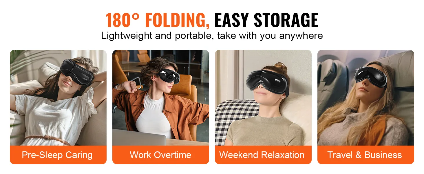 Perfect for Any Occasion: VEVOR eye care massager is 180° foldable and portable, ideal for home, travel, or office use—a thoughtful gift for parents, friends, and employees alike. Use it to relieve eye muscle tension, fatigue, and puffiness, promoting blood circulation and enhancing sleep quality.