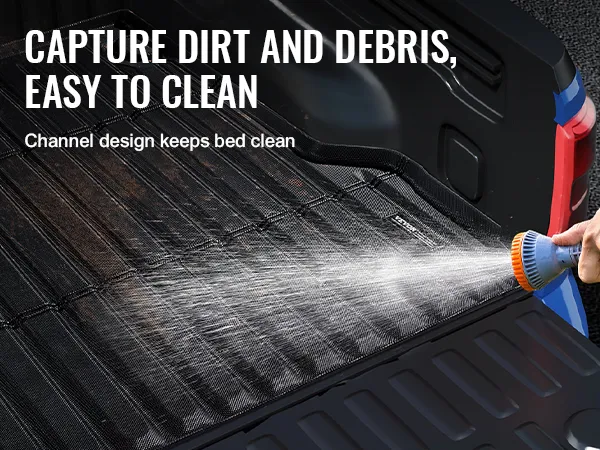 The surface grooves naturally capture mud and debris, preventing them from splattering everywhere. You can quickly rinse the bed mat clean with a hose, and the flexible material allows for easy movement and folding for cleaning.