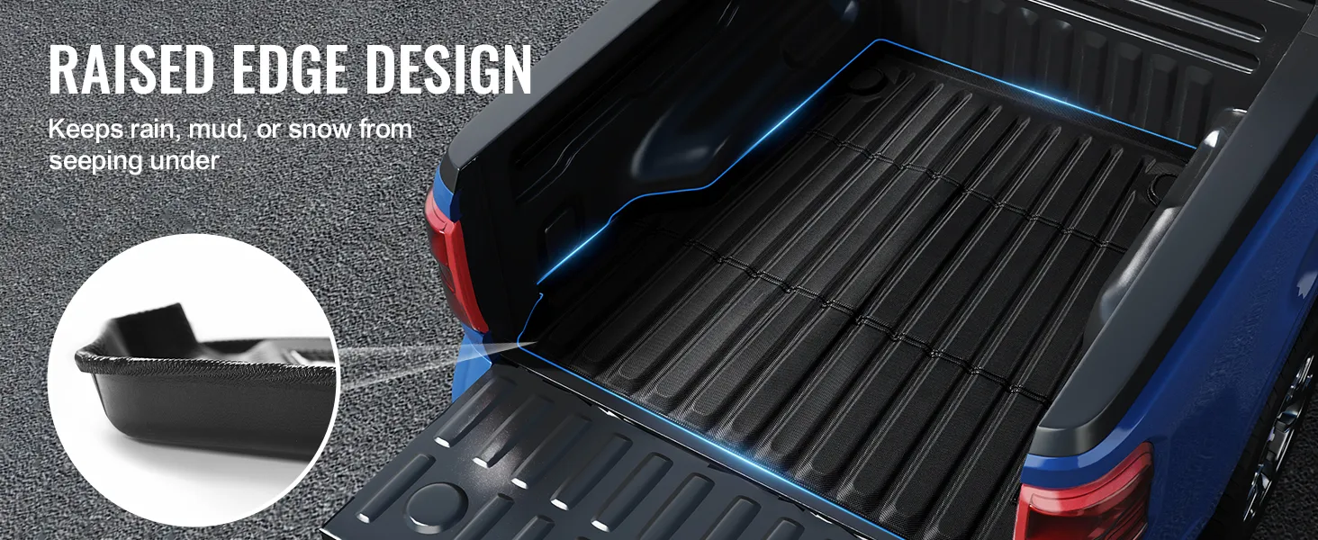 Full Surround Edge Design: The elevated edge design around the bed mat for truck effectively blocks rainwater, mud, and snow from entering underneath, preventing accumulation that can lead to dirt.