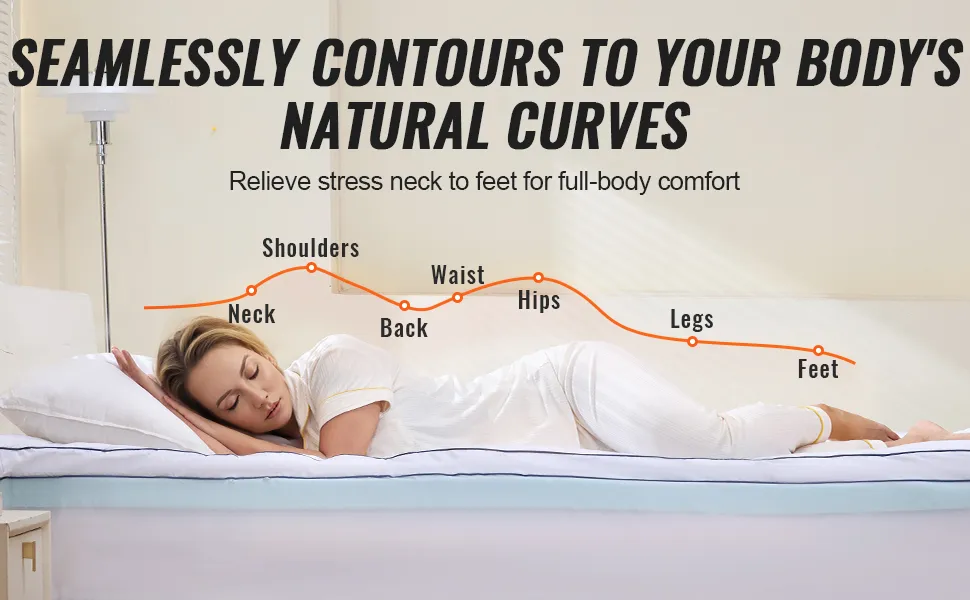 Verbeterd slaapcomfort: Onze matrastopper is ontworpen om zich aan te passen aan de rondingen van uw lichaam. Deze vorm verlicht drukpunten en bevordert diepe ontspanning. Het traag terugverende traagschuim past zich aan uw lichaam aan, verlicht ongemak en ondersteunt de natuurlijke uitlijning van de wervelkolom, wat zorgt voor een ideale slaapomgeving.