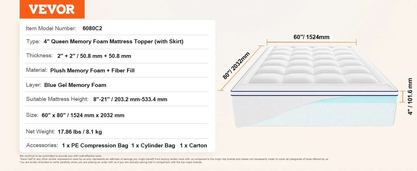 VEVOR Mattress Topper Premium Memory Foam Fiber Fill Queen 101.6 mm Thickness VEVOR Mattress Topper Premium Memory Foam Fiber Fill Queen 101.6 mm Thickness