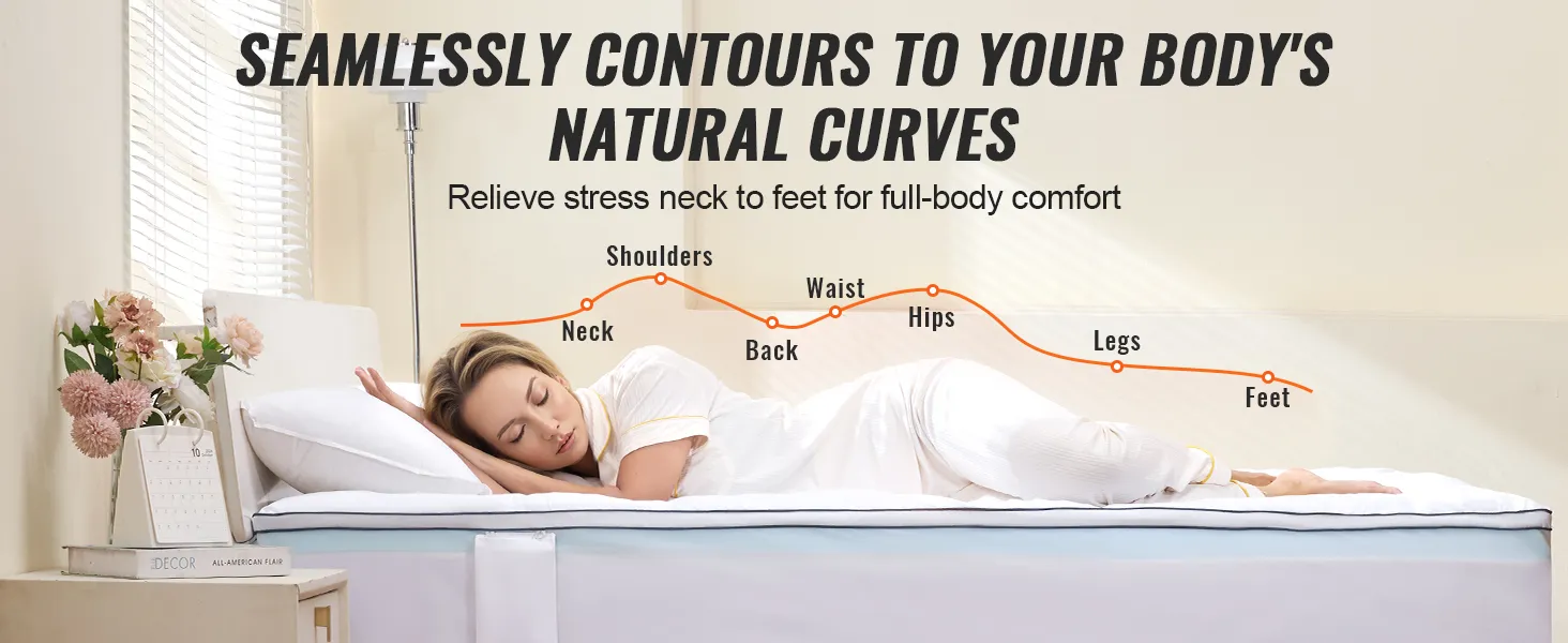 Our mattress bed topper is ergonomically designed to fit your body, it provides tailored support for different areas, evenly distributing pressure to reduce fatigue and safeguard your spine. Enjoy deep, restful sleep every night.
