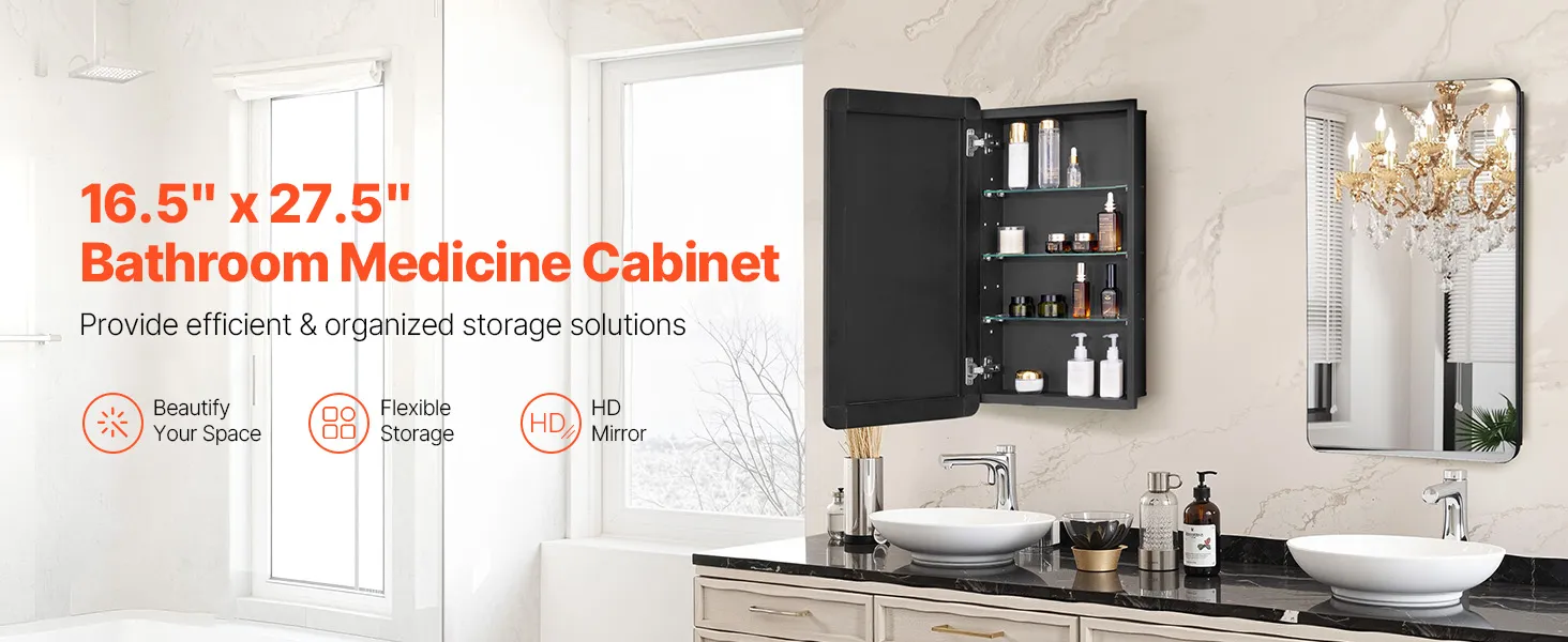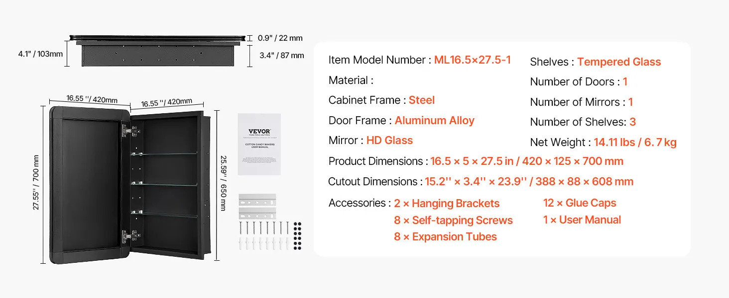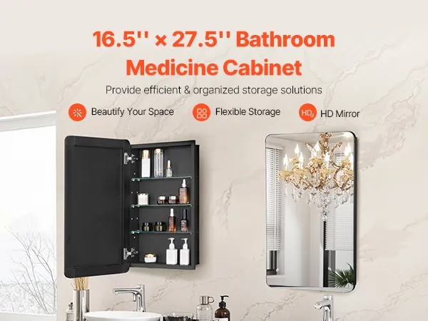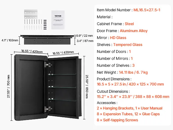 Geschikt voor verschillende maten: Totale afmetingen (L x D x H): 16,5 x 5 x 27,5 inch (420 x 125 x 700 mm); Afmetingen vlakke montage (L x D x H): 15,2 x 3,4 x 23,9 inch. Dit afgeschuinde medicijnkastje met HD-spiegel creëert een lichte en ruimtelijke sfeer in uw badkamer.