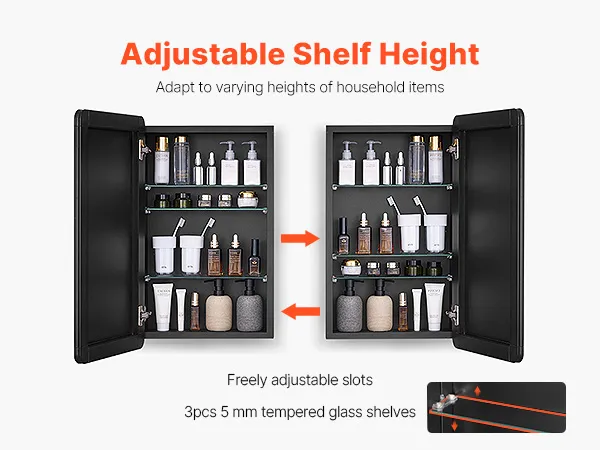 De planken van het spiegelmedicijnkastje zijn eenvoudig in hoogte en bodem te verstellen, zodat u individuele opbergruimte hebt voor artikelen van alle formaten. Ideaal voor grote flessen, kleine cosmetica en alles daartussenin.