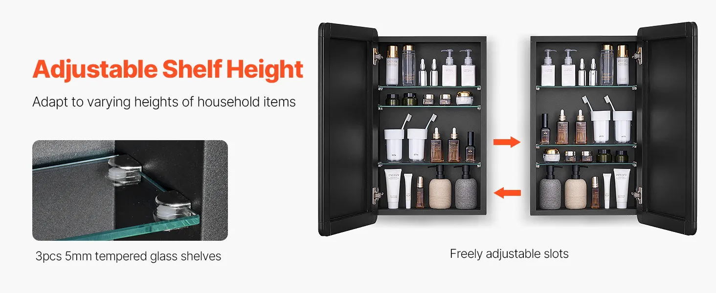Ruime opbergruimte: het spiegelmedicijnkastje is voorzien van 5 mm dik, drielaags, verstelbaar gehard glas, wat de opbergcapaciteit vergroot en tegelijkertijd een vrije, ordelijke indeling mogelijk maakt. Of u nu kleine medicijnflesjes, grote shampooflessen of diverse cosmetica opbergt, u vindt voor alles een ideale plek en vermijdt zo ongebruikte ruimte.