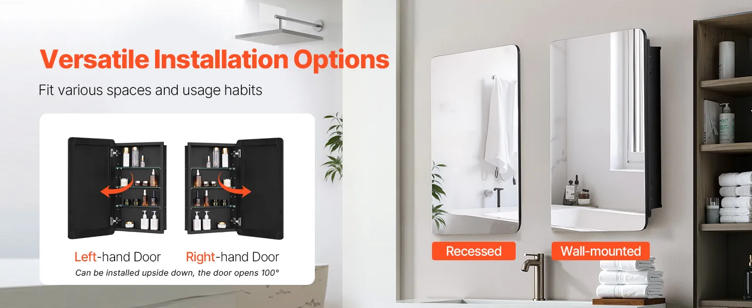 Aan de muur bevestigd of ingebouwd: De badkamerspiegelkast kan op twee manieren worden geïnstalleerd: aan de muur bevestigd of ingebouwd. Bovendien ondersteunt de kast een omgekeerde installatie, waardoor u de draairichting van de deur kunt veranderen. Kies de optie die het beste past bij de indeling van uw badkamer en uw persoonlijke voorkeuren, zodat u de ruimte optimaal benut.
