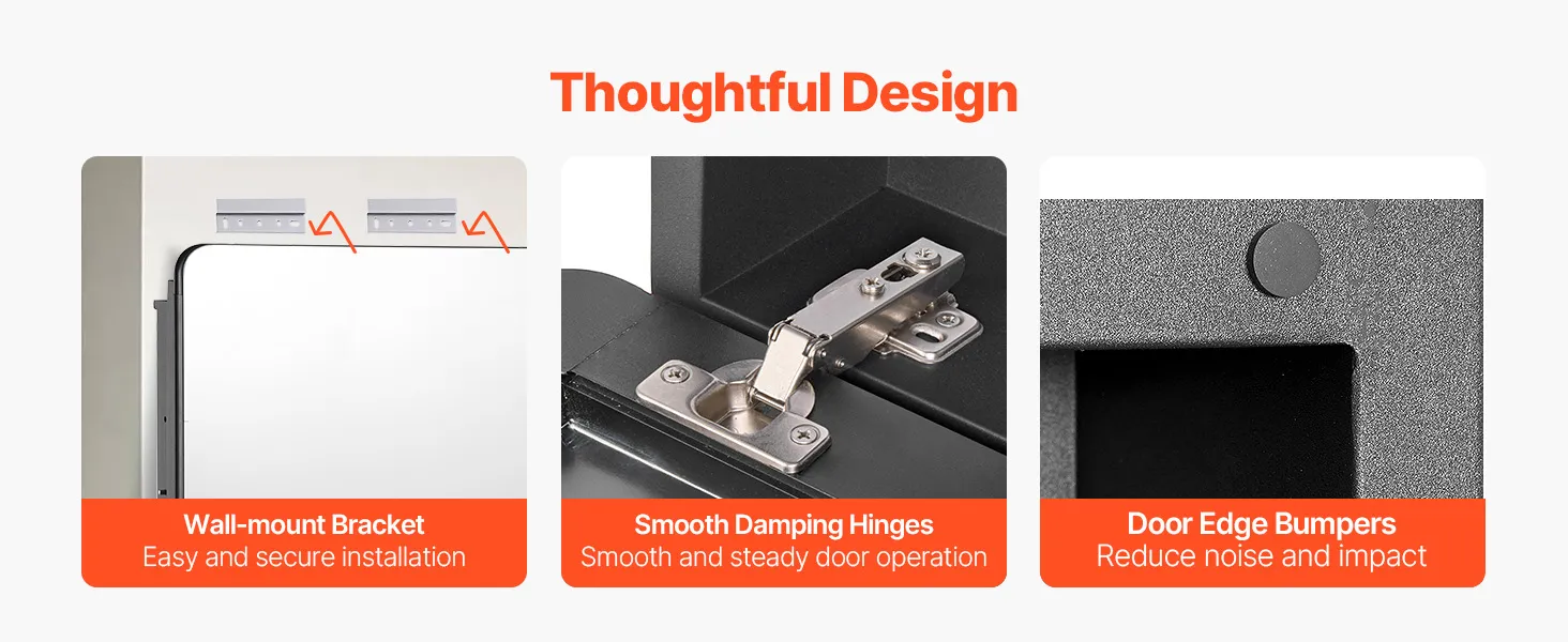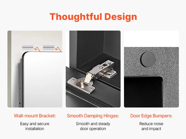 Extra hoogwaardige kenmerken: Deze spiegelkast is uitgerust met hoogwaardige, geluiddempende scharnieren, waardoor hij soepel en geruisloos open en dicht gaat. Het oppervlak is krasbestendig en roestbestendig, terwijl de meegeleverde pads het geluid verder verminderen en zo het algehele comfort voor de gebruiker vergroten.