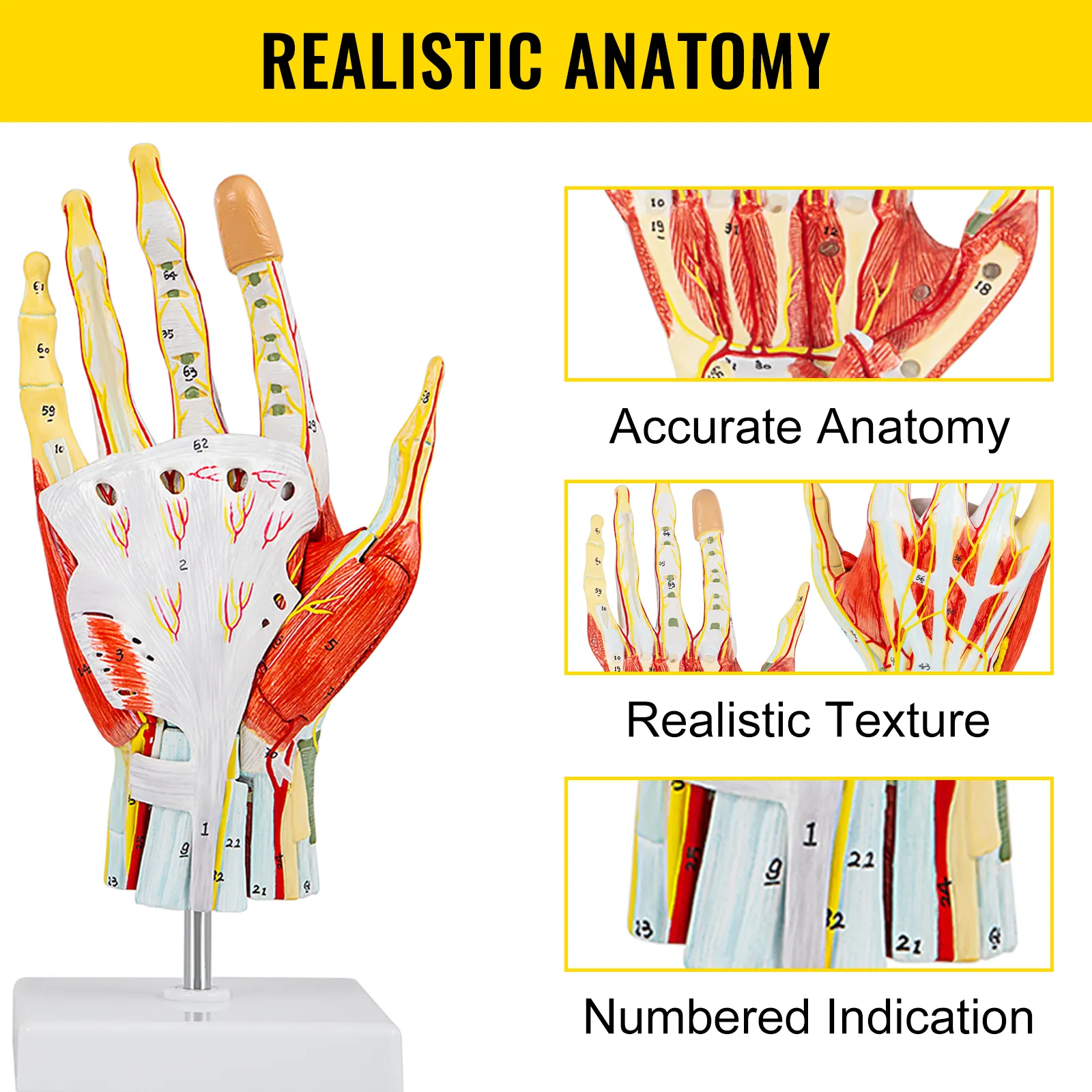 Het handskelet en het spiermodel kunnen in zeven delen worden opgedeeld. De verdeling van de belangrijkste spieren, ligamenten, zenuwen en bloedvaten van de hand wordt ook in detail getoond.