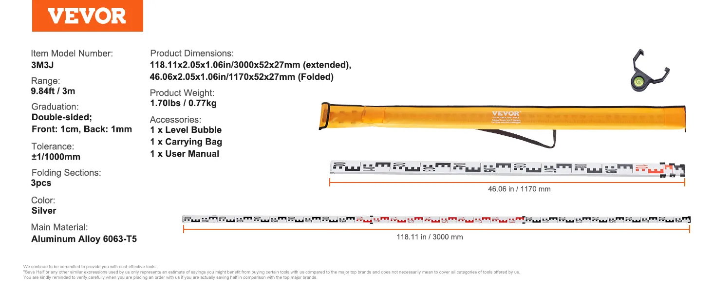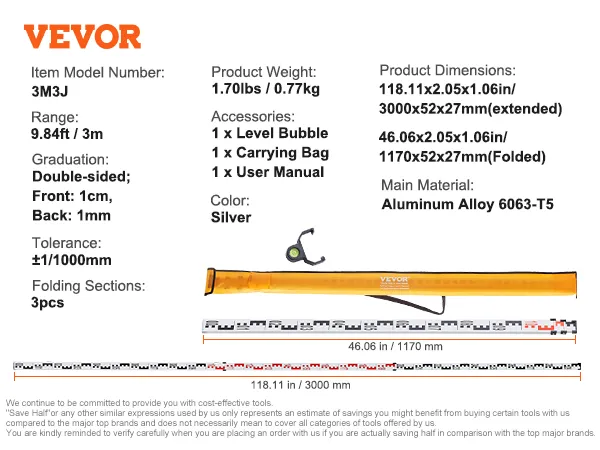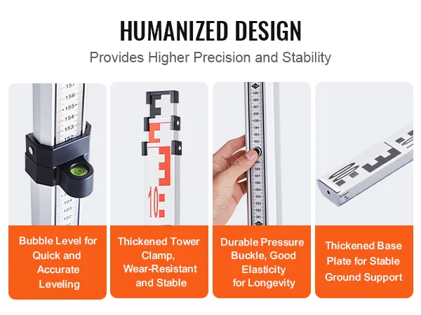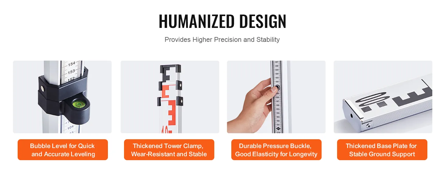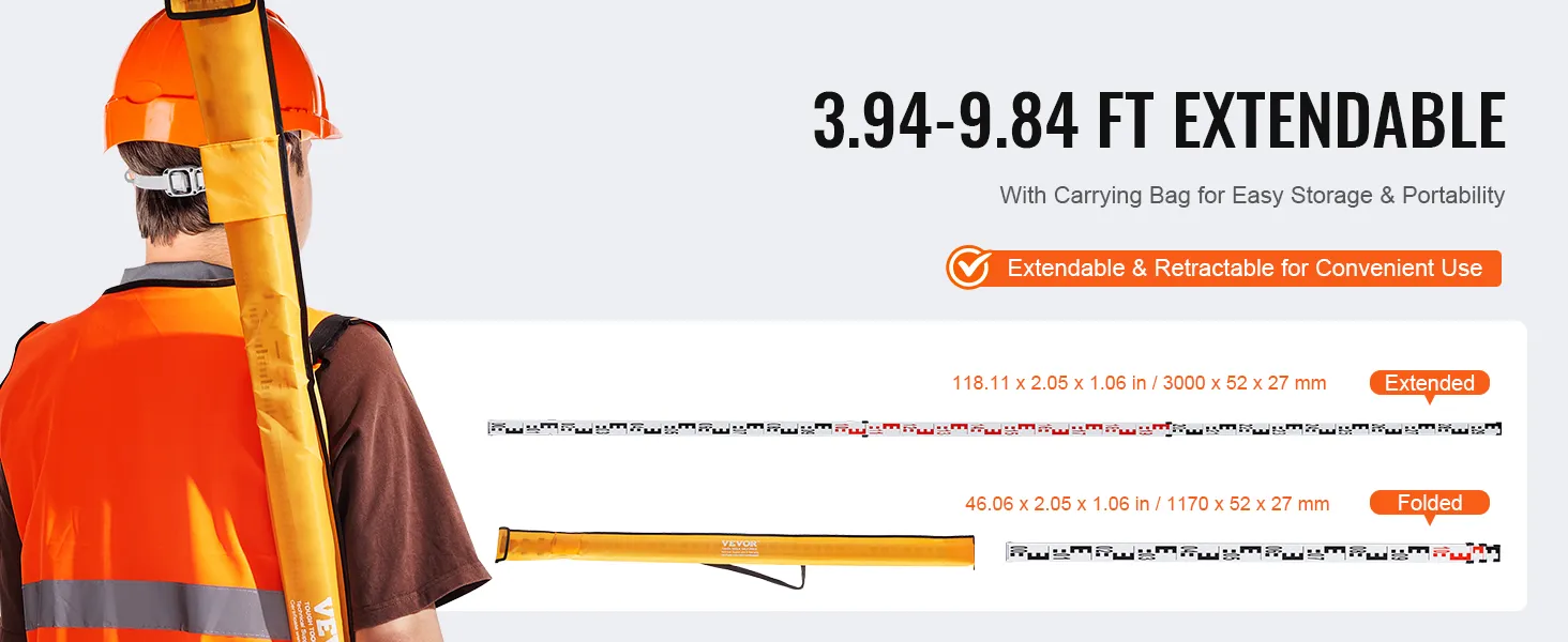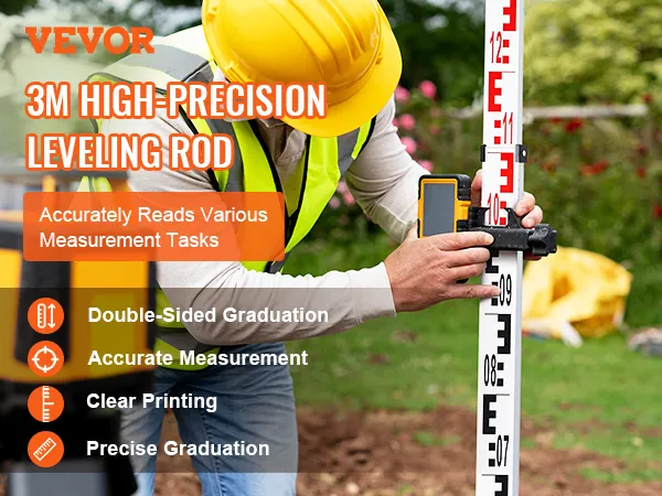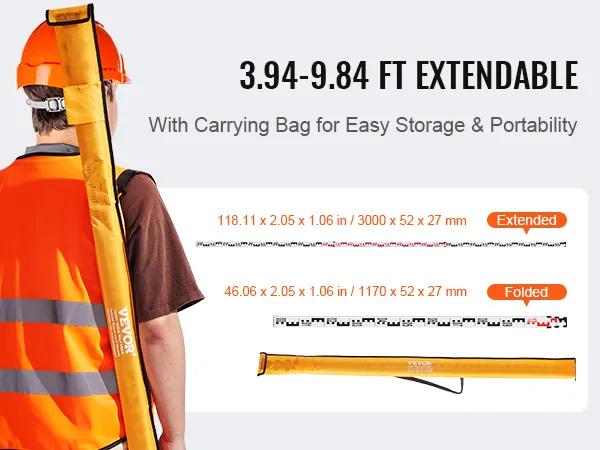 VEVOR's grade rod, made of sturdy aluminum, is lightweight and foldable for easy transport and storage. It features precise markings for accurate leveling, perfect for architectural laser and optical measurements.