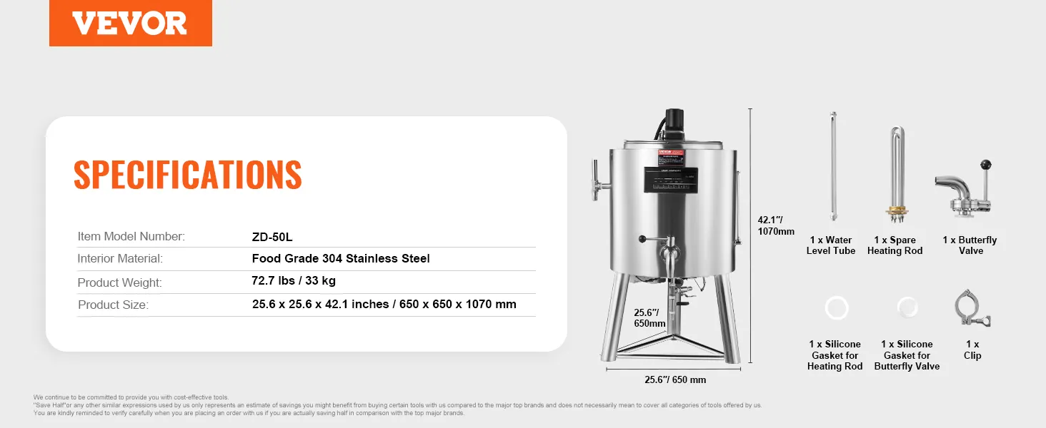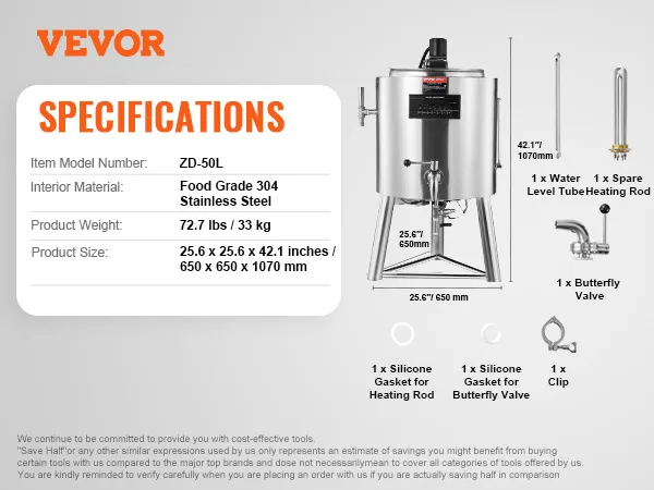 VEVOR Milk Pasteurizer 50L, Commercial Milk Pasteurization Machine, Food Grade 304 Stainless Steel, Professional Pasteurization with Time and Temperature Control, for Milk Juice Yogurt Sterilization