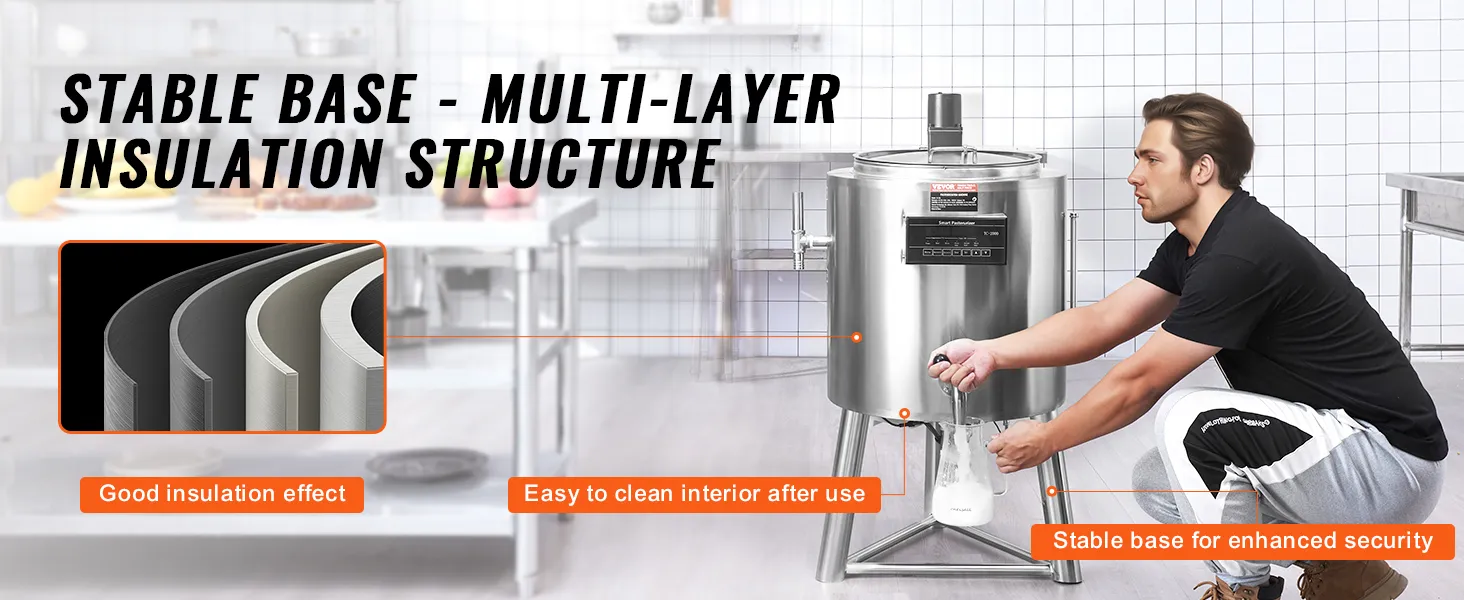 Reliable Stainless Steel Material: The inner tank is crafted from food-grade 304 stainless steel, with a seamless, durable, and corrosion-resistant design. Easy to clean and meeting food security standards, ensuring product purity. The milk pasteurizer machine operates smoothly, minimizing vibration to increase safety.