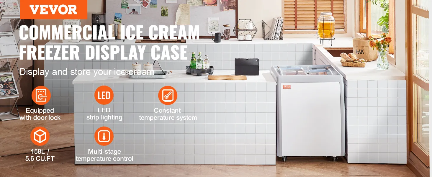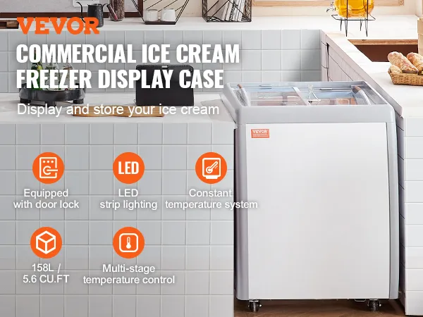 PROFESSIONELE IJS DISPLAYKAST: Deze commerciële ijsvitrine biedt plaats aan 4 grote ijsbekers en is uitgerust met LED-verlichting en een goed zichtbare deur van gehard glas om het weergave-effect te verbeteren. De klant kan eenvoudig zijn favoriete ijsje kiezen.