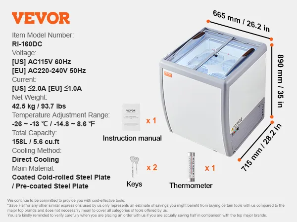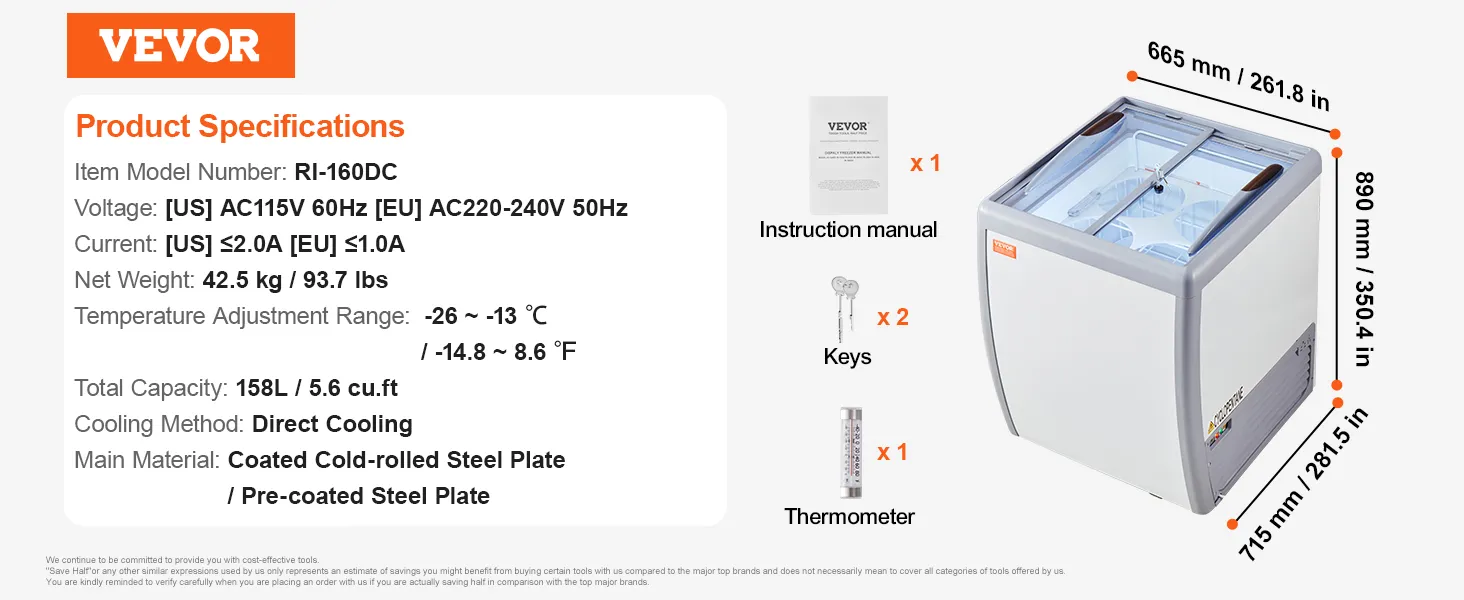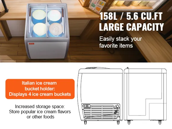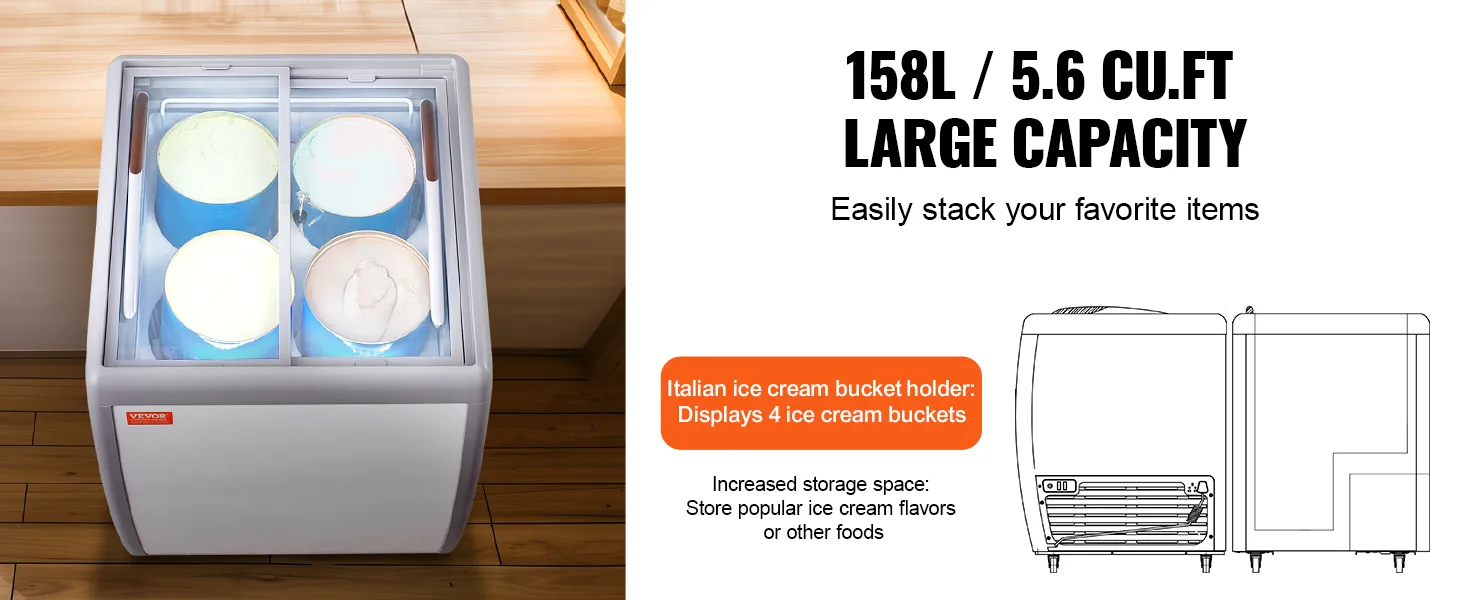 Large Storage Space: The chest freezer offers 158 L / 5.6 cu.ft of storage space. In addition to displaying tubs at the top of the case, there is extra storage space at the bottom of the machine. You can store an additional tubs to help replenish your most popular ice cream or other food items.