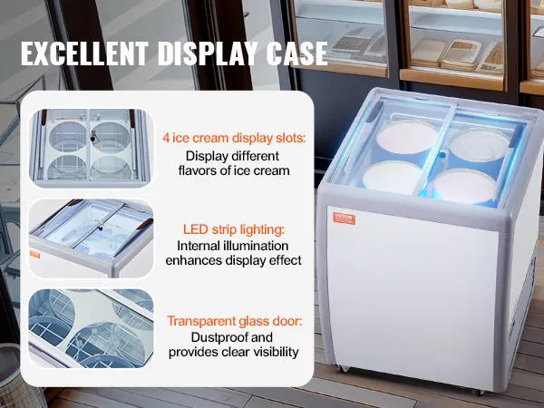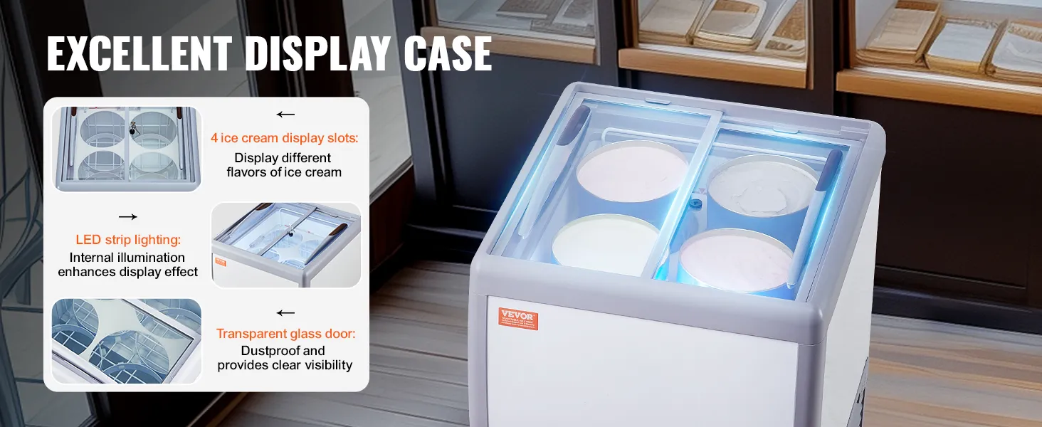 Professional Ice Cream Display Case: This commercial ice cream display case can accommodate 4 large ice cream tubs and features LED strip lighting and a high-visibility tempered glass door to enhance the display effect. Customers can easily choose their favorite ice cream.