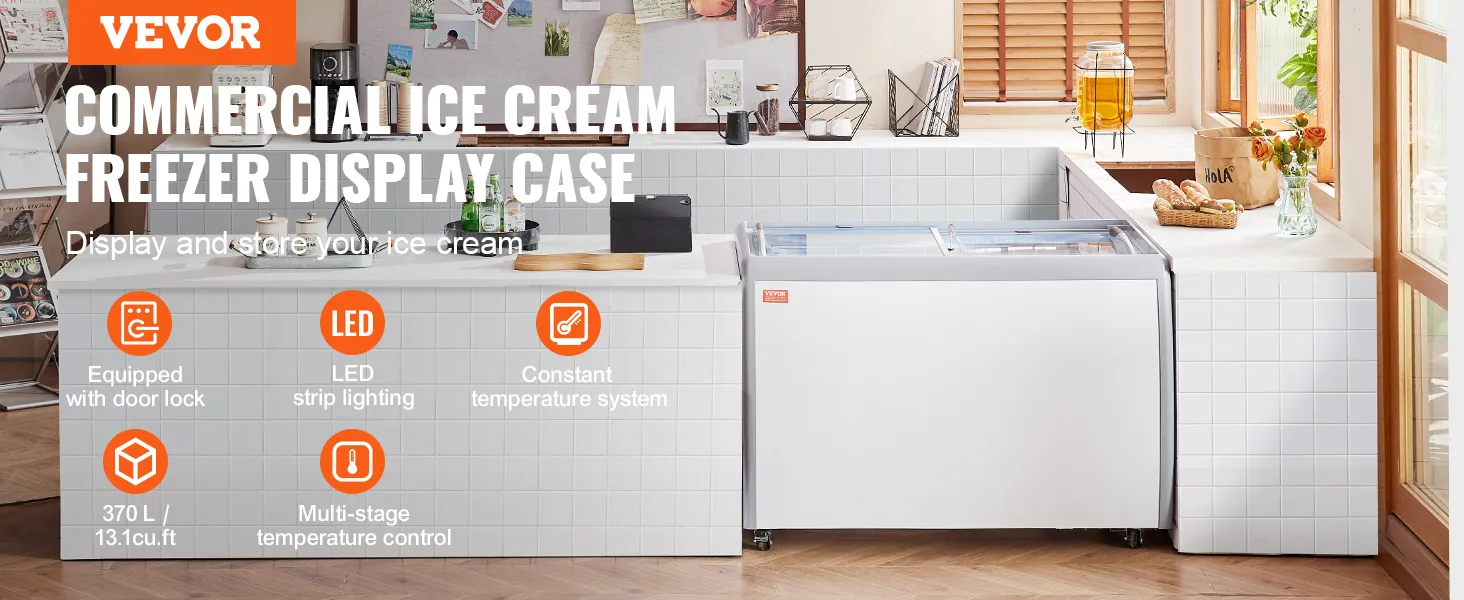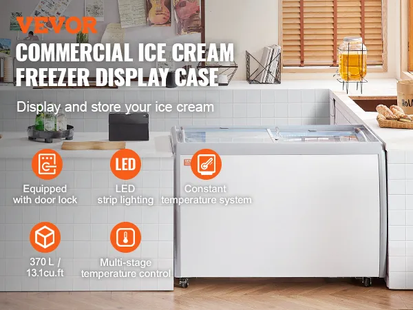 Instelbare temperatuur: de ijsvitrine heeft een temperatuuraanpassingsbereik op meerdere niveaus van -26 tot -13 °C (14,8 tot 8,6 °F) om aan verschillende vriesbehoeften te voldoen. De thermostaat houdt het ijs in optimale conditie en bespaart tegelijkertijd energie.