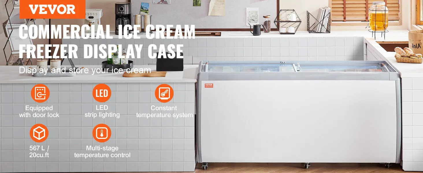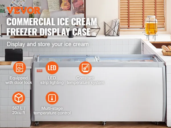 Instelbare temperatuur: de ijsvitrine heeft een temperatuuraanpassingsbereik op meerdere niveaus van -26 tot -13 °C (14,8 tot 8,6 °F) om aan verschillende vriesbehoeften te voldoen. De thermostaat houdt het ijs in optimale conditie en bespaart tegelijkertijd energie.