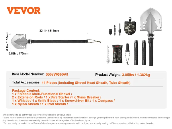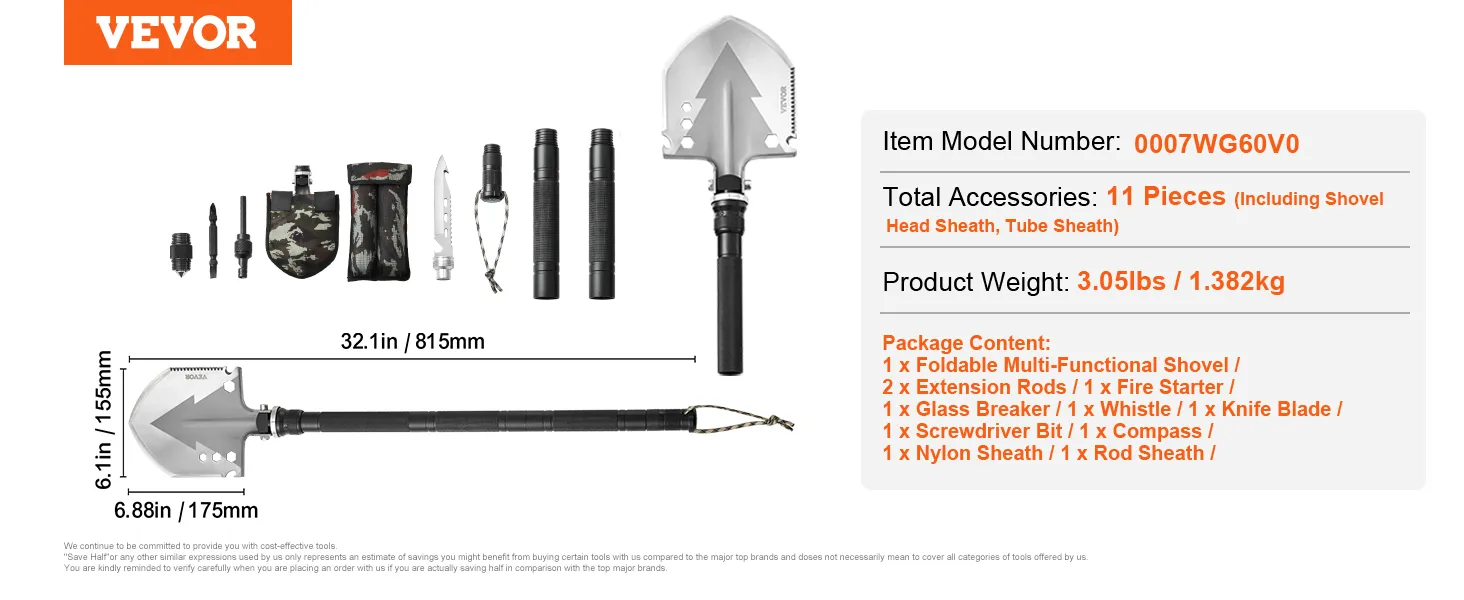 VEELZIJDIGE CAMPING MULTI TOOL SET: Deze survivalschep bevat een schep, mes, kompas, fluitje, glasbreker, vuurstarter en meer - perfect voor graven, hakken, vuur maken, snijden, signaleren en flessen openen. Het is een krachtig hulpmiddel met een hoge functionaliteit.