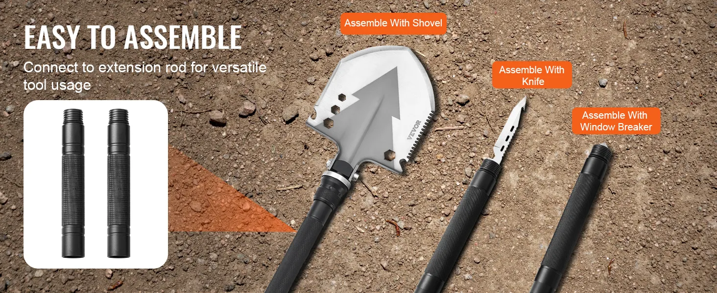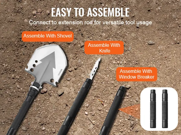 Opschroefbare verlengstokken: deze draagbare overlevingsschep wordt geleverd met 2 afneembare, opschroefbare verlenghandgrepen waarmee u de lengte van de schep naar behoefte kunt aanpassen. Het antislipdraadontwerp zorgt voor een sterkere grip voor betere controle.