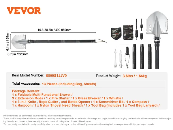 Opschroefbare verlengstokken: deze draagbare overlevingsschep wordt geleverd met 3 afneembare, opschroefbare verlenghandgrepen waarmee u de lengte van de schep naar behoefte kunt aanpassen. Het antislipdraadontwerp zorgt voor een sterkere grip voor betere controle.