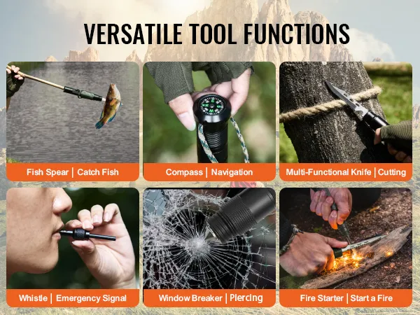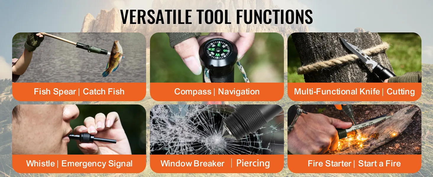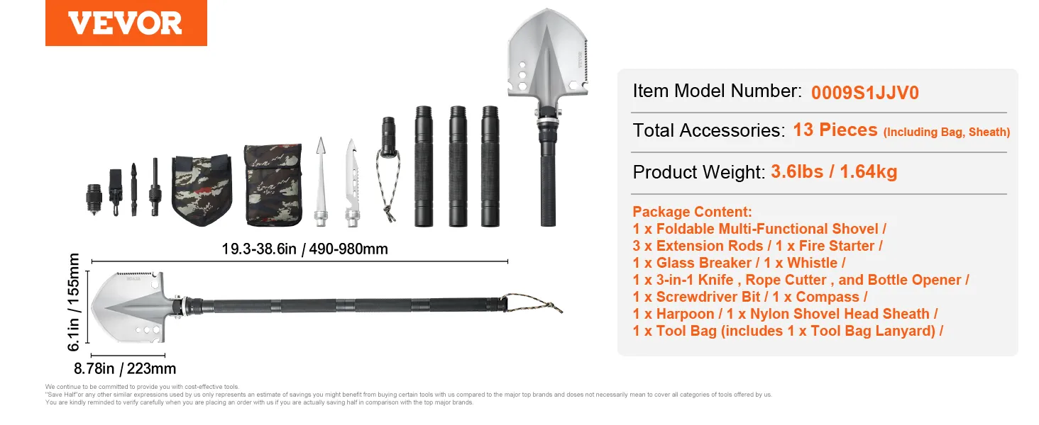 VEELZIJDIGE CAMPING MULTI TOOL SET: Deze survivalschep bevat een schep, mes, kompas, fluitje, glasbreker, vuurstarter en meer - perfect voor graven, hakken, vuur maken, snijden, signaleren en flessen openen. Het is een krachtig hulpmiddel met een hoge functionaliteit.