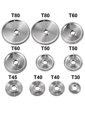 Het draaibank tandwiel is samengesteld uit 2 x 80T tandwielen, 2 x 60T tandwielen, 2 x 50T tandwielen, 2 x 40T tandwielen, 1 x 45T tandwiel, 1 x 30T tandwiel en 2 extra riemen.