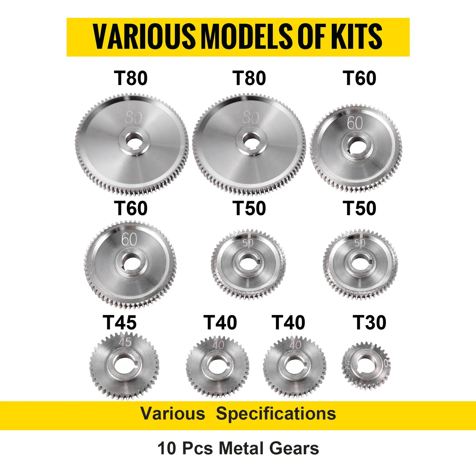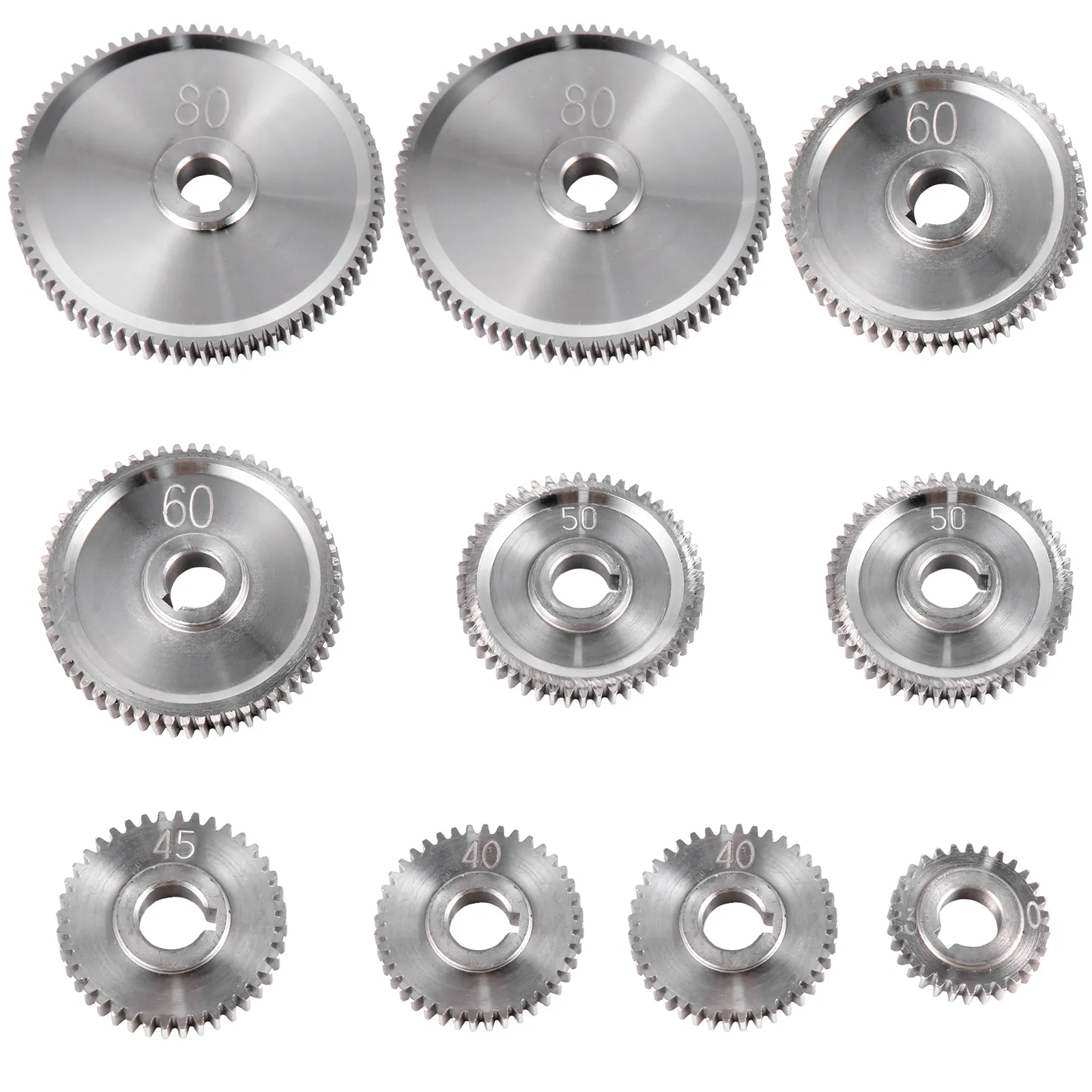 【10 STUKS VERSNELLINGSSETS】 - De mini-draaibank tandwielset bevat 2 x 80T versnellingen, 2 x 60T versnellingen, 2 x 50T versnellingen, 2 x 40T versnellingen, 1 x 45T versnelling, 1 x 30T versnelling en 2 extra riemen.