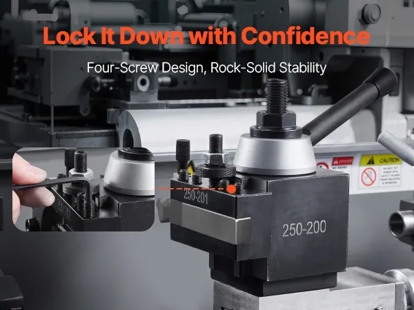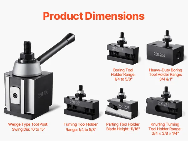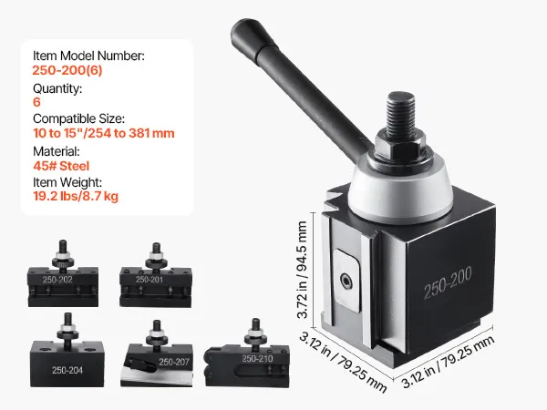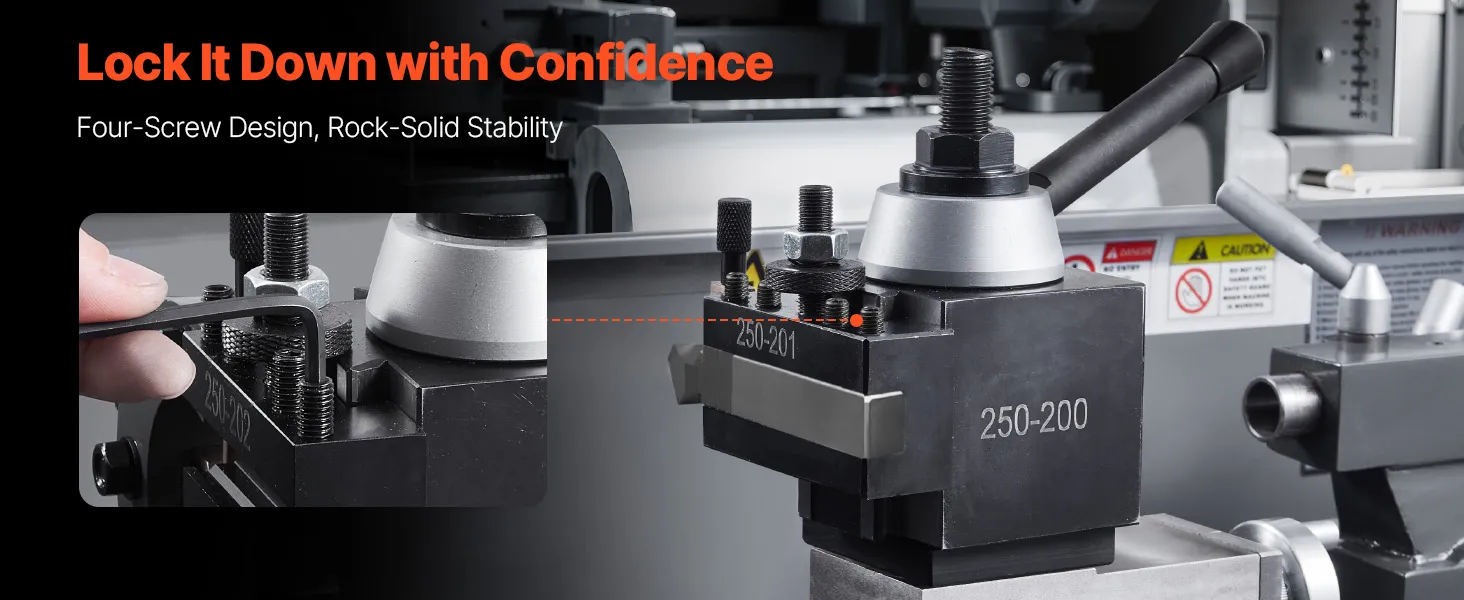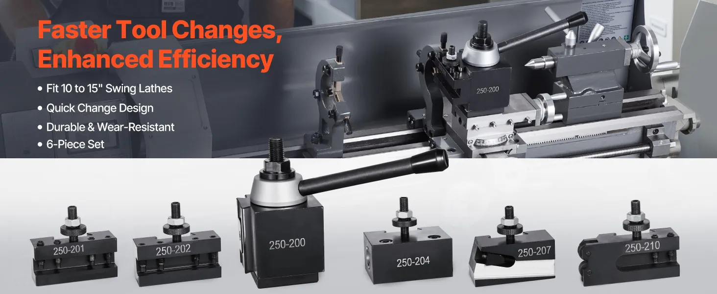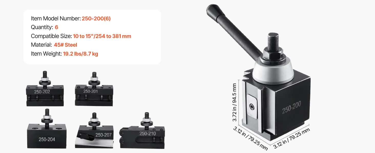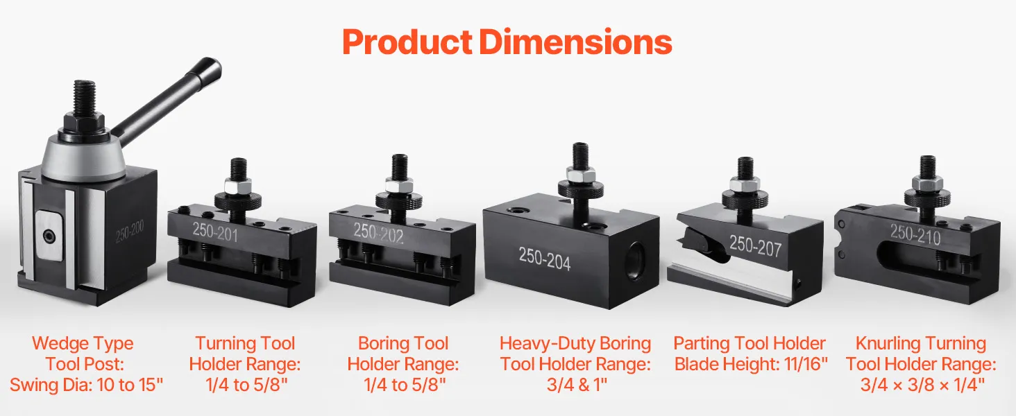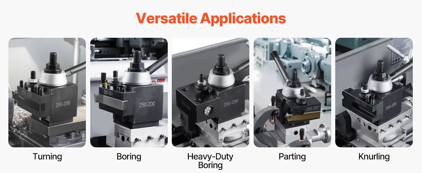 Versatile Compatibility: Designed for 10 to 15 in lathes, this quick change tool post set connects to a lathe via an M16×1.5 threaded interface. Note: It is not yet compatible with VEVOR metal lathes. A compatible version is currently in development