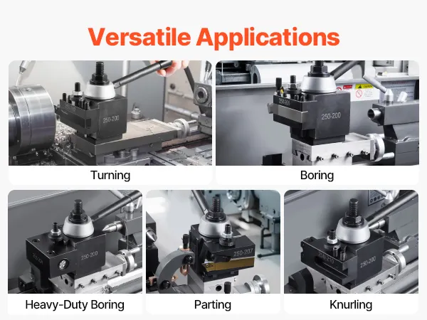 This lathe quick change tool post is designed to handle a variety of lathe tasks, including turning, boring, heavy-duty boring, parting, and knurling. It enhances performance across diverse machining applications.