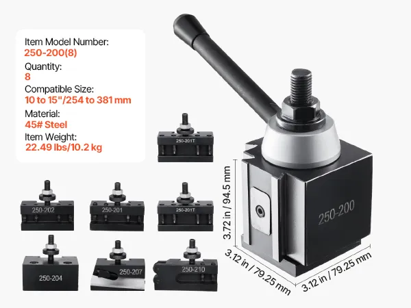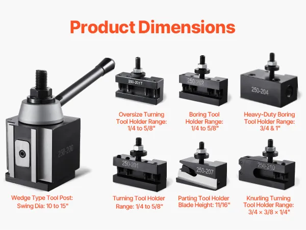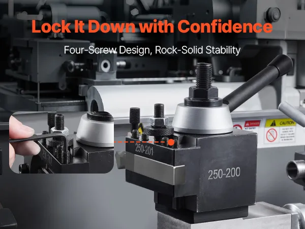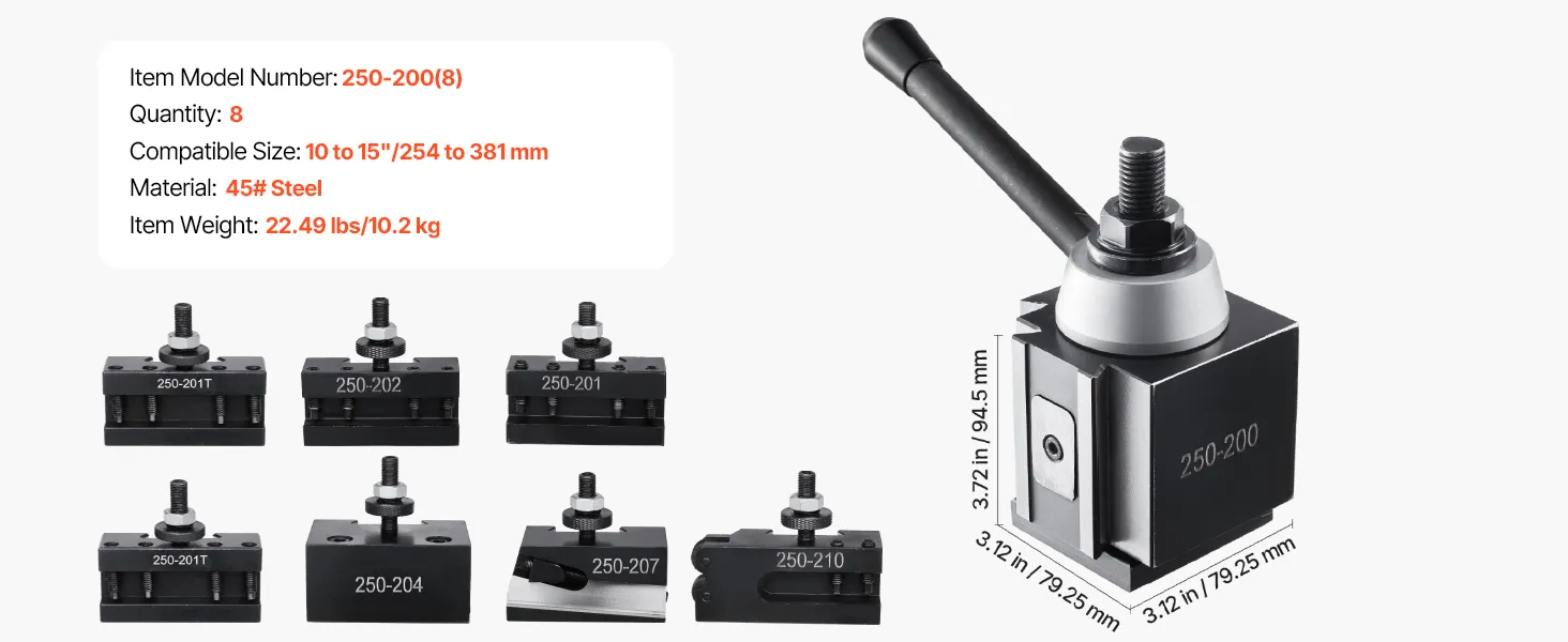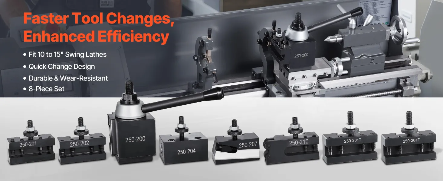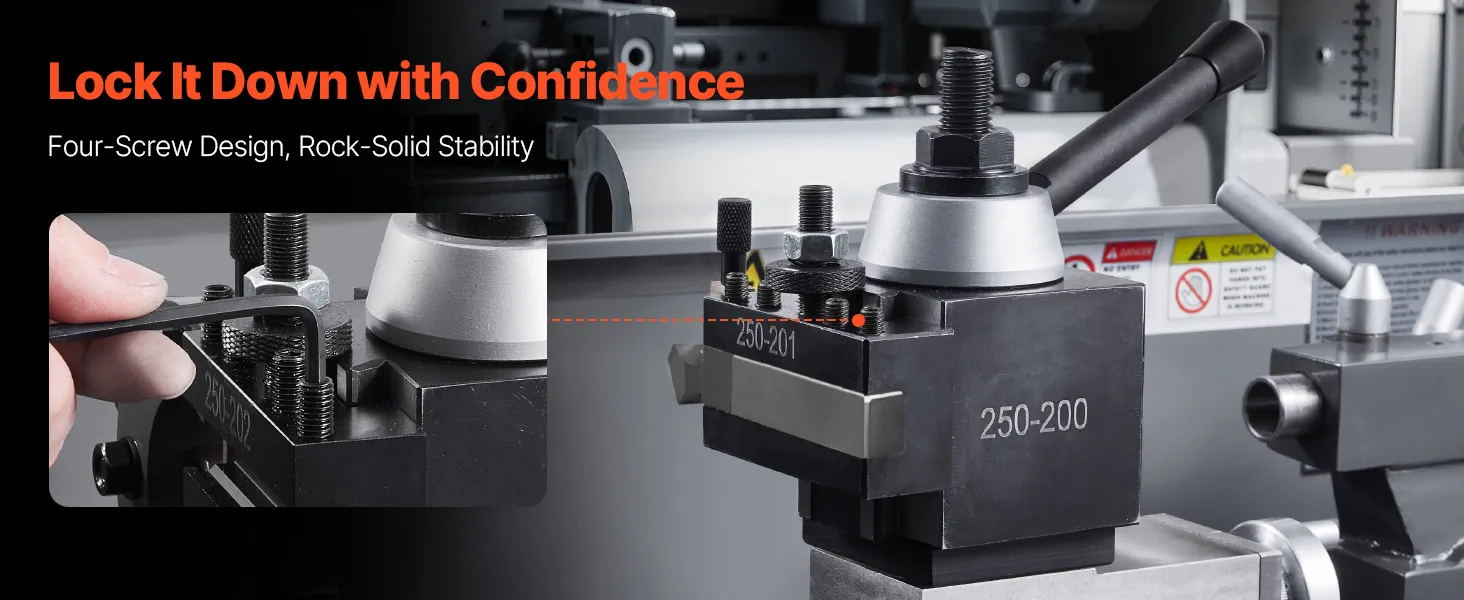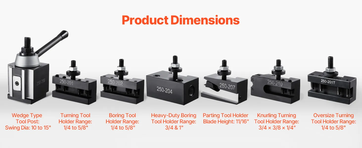 Versatile Compatibility: Designed for 10 to 15 in lathes, this quick change tool post set connects to a lathe via an M16×1.5 threaded interface. Note: It is not yet compatible with VEVOR metal lathes. A compatible version is currently in development