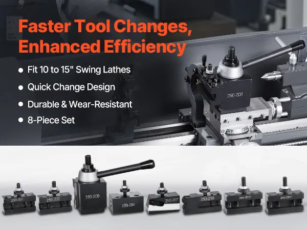 Our quick change tool post set fits 10 to 15 in lathes and works with various models. It enables fast tool changes with a handle turn, precise alignment with a rotating screw, and long-lasting durability with cast iron construction. Simple to install, it is ideal for upgrading your workshop.
