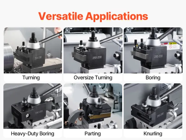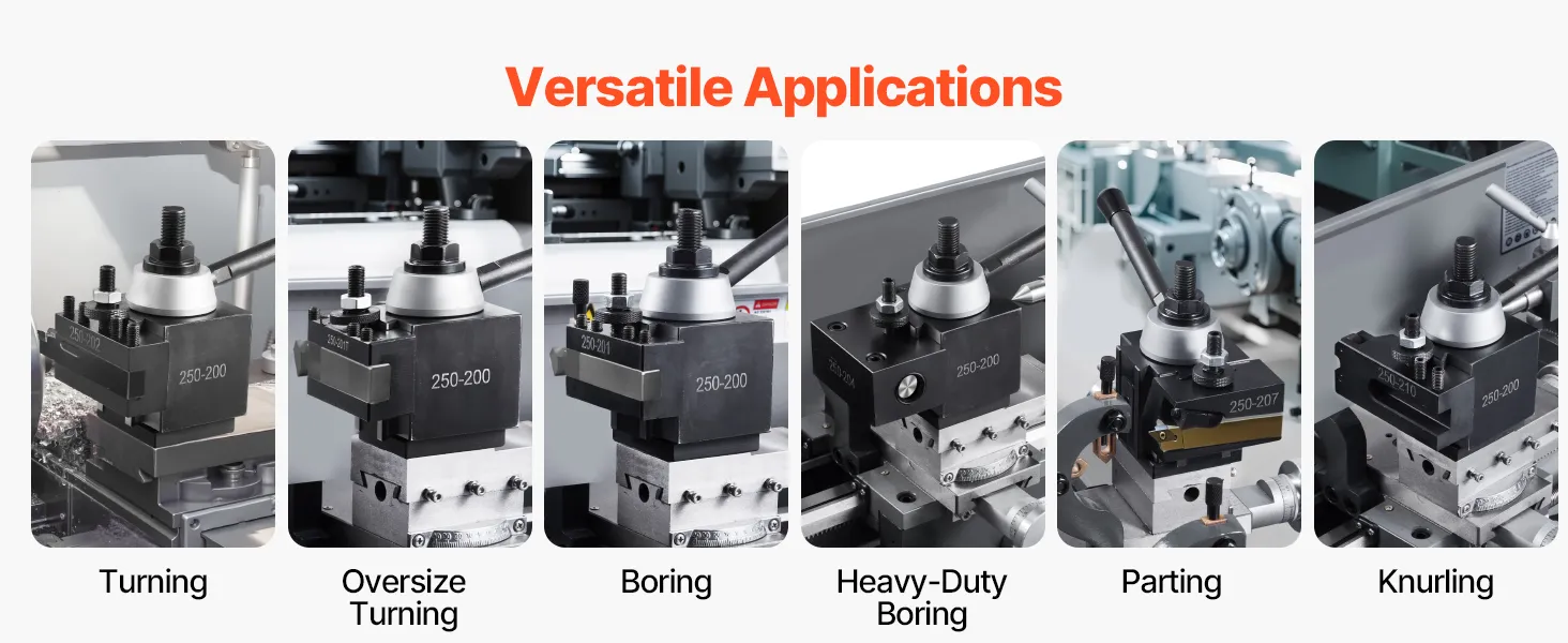 This lathe quick change tool post is designed to handle a variety of lathe tasks, including turning, oversize turning, boring, heavy-duty boring, parting, and knurling. It enhances performance across diverse machining applications.