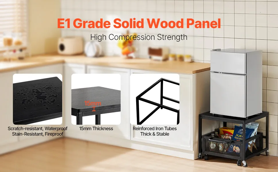 Stevig en duurzaam: Deze minikoelkaststandaard met opbergruimte is gemaakt van verdikt E1-kwaliteit eco-massief hout en versterkte ijzeren buizen. Het biedt een stevig en stabiel oppervlak dat tot 90 kg (198 lbs) kan dragen. Ook ideaal als wasmachinestandaard, bijzettafel, printerstandaard of multifunctionele trolley