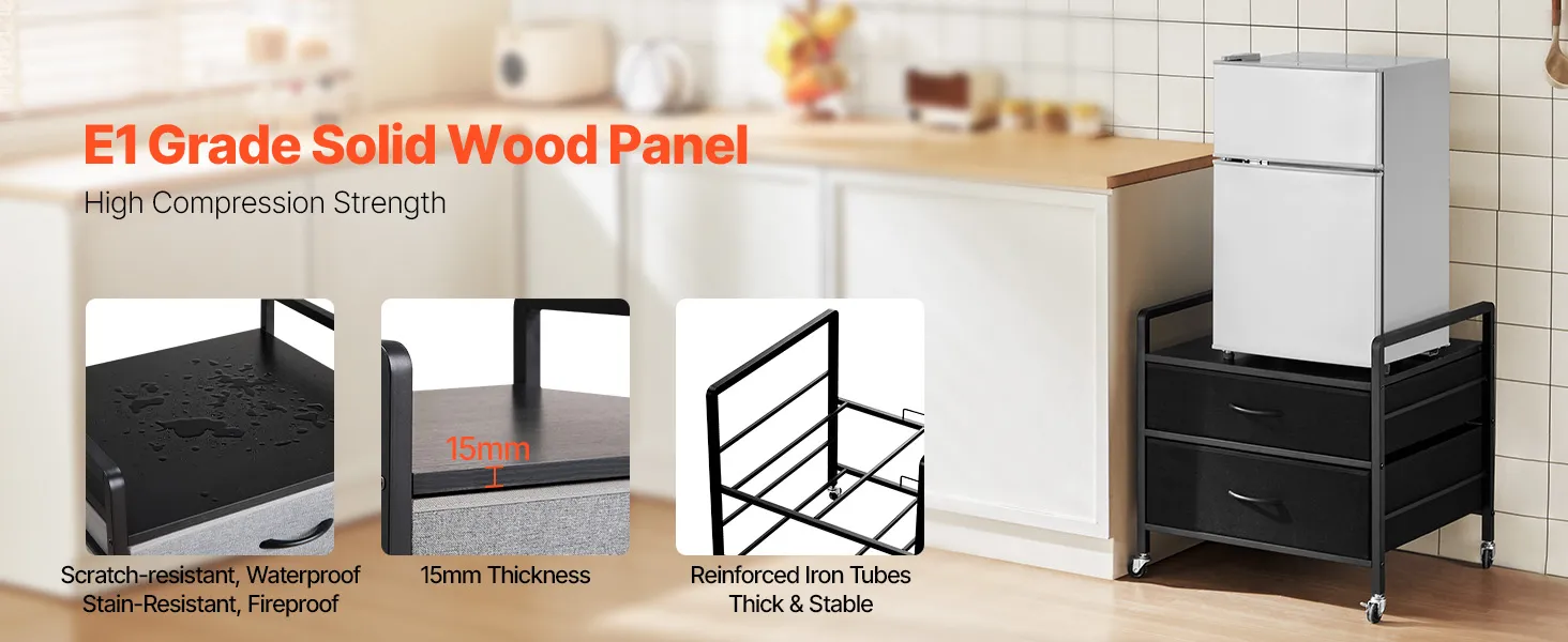 Sturdy & Durable: This mini fridge stand with storage is built with thickened E1-grade solid wood eco-board and reinforced iron tubes, plus 2 breathable non-woven fabric drawers with a linen-like finish. The sturdy tabletop supports up to 176 lbs(80 kg), ensuring stability and making it ideal for use as a fridge/washing machine stand, side table, printer stand, or utility cart.