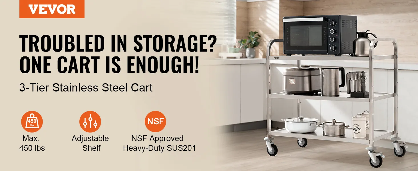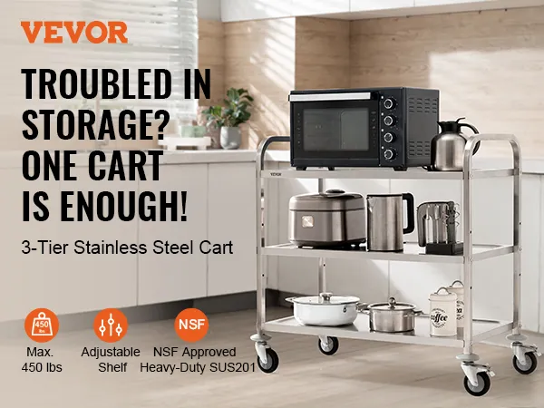 De VEVOR keukengereedschapswagen is gemaakt van staal van industriële sterkte. Hij heeft een capaciteit van maximaal 450 pond. Dit maakt hem ideaal voor het opbergen van grote keukenapparaten. Met vier 4-inch wielen is hij heel gemakkelijk te verplaatsen. De 80mm mandgreep en PP-voering helpen om spullen veilig te houden tijdens het verplaatsen.