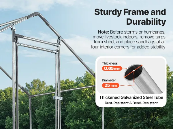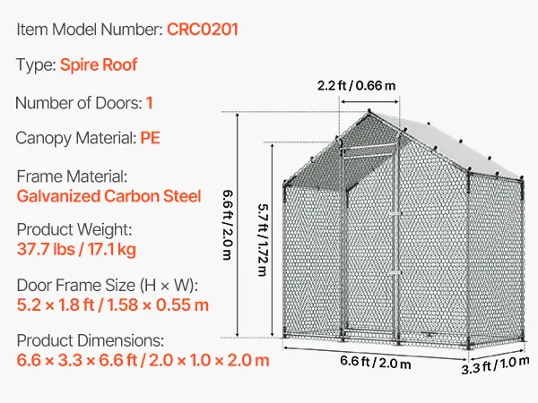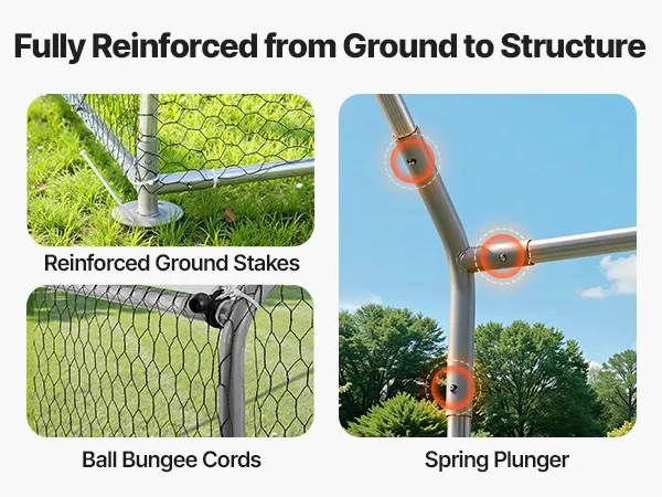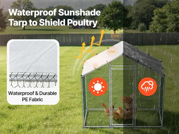 Versterkt gegalvaniseerd stalen frame: Gemaakt van corrosiebestendig, gegalvaniseerd staal en verankerd met grondpennen voor optimale stabiliteit. Deze kippenren is ontworpen om bestand te zijn tegen harde wind, sneeuwval en extreme weersomstandigheden, wat een lange levensduur garandeert.