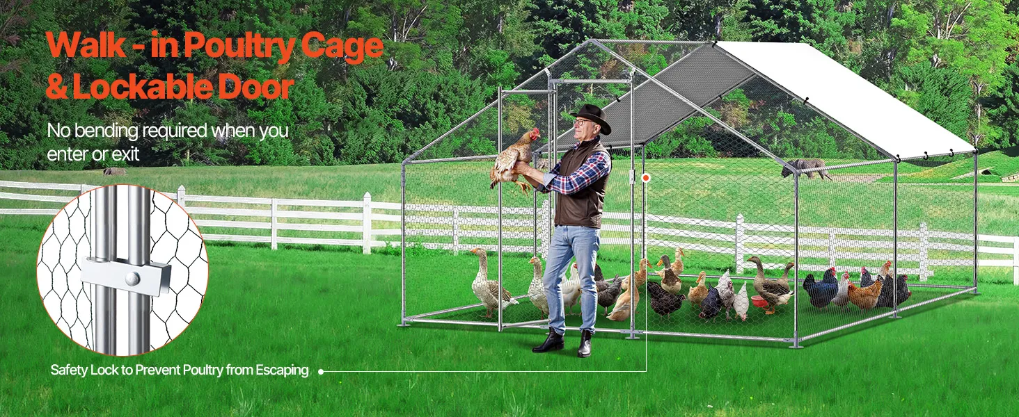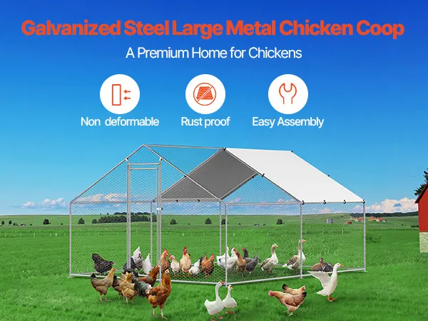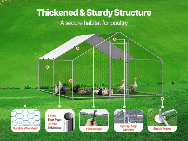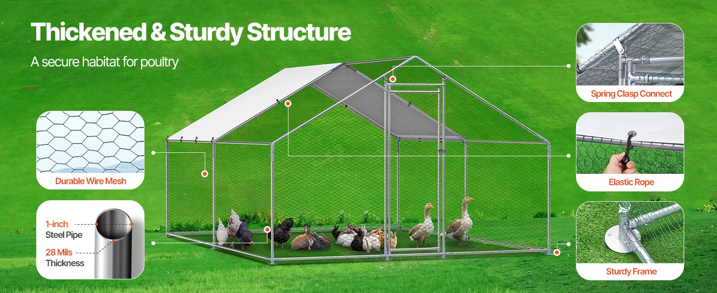 Sturdy Structure: With 1" thick galvanized steel pipes and precise welding, this chicken house boasts stability and wind resistance. The top cover facilitates effective drainage, preventing water accumulation. Reinforced with hexagonal protective mesh, it provides a securer space for the poultry.