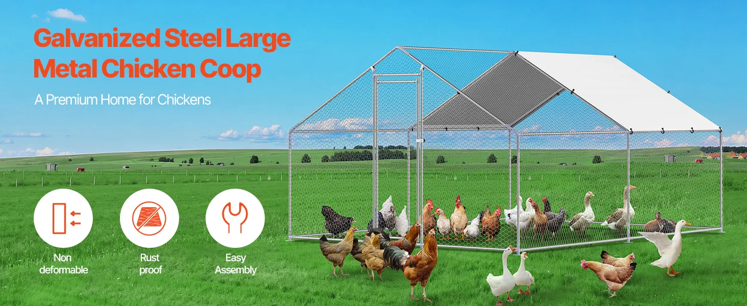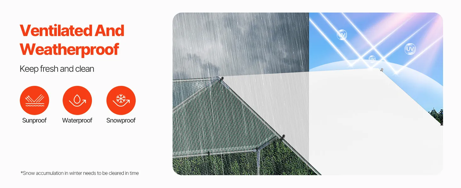 Weatherproof & Corrosion-proof: Crafted from galvanized steel pipes, and rigorously tested against salt spray, this chicken coop withstands harsh weather conditions like rain, wind, and sun exposure, ensuring long-term stability and securety.