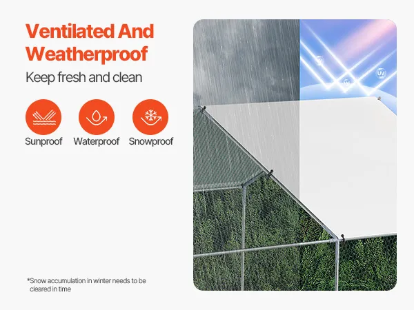 Spacious Living Area: Offering a generous 9.8x13.1x6.5 ft of space, this metal chicken run features four-sided ventilation, creating a healthy and comfortable environment. The PE-coated canopy provides sun protection, waterproofing, and tear resistance, shielding your poultry from external elements.