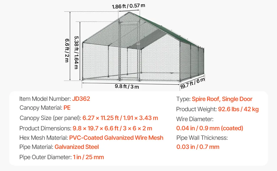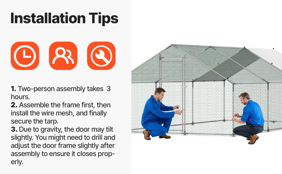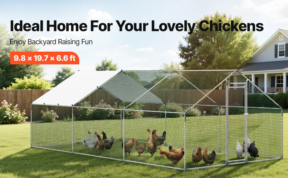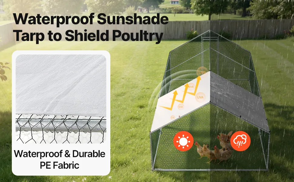 Het VEVOR inloophok en de ren geven uw kippen meer ruimte om te zitten, te badderen en eieren te leggen. Het biedt een comfortabel thuis voor uw kippen, zonder stress in vergelijking met de krappe ruimte van een alternatief. Het gegalvaniseerde stalen frame is ontworpen met de beste materialen en is roestvrij. De PE-luifel is regen-, zon- en winddicht. Deze combinatie van duurzaamheid en stevigheid maakt ons hok absoluut de prijs waard. U hoeft de onderdelen op de lange termijn niet te vervangen, want het is altijd de moeite waard.