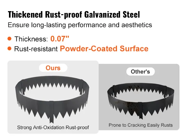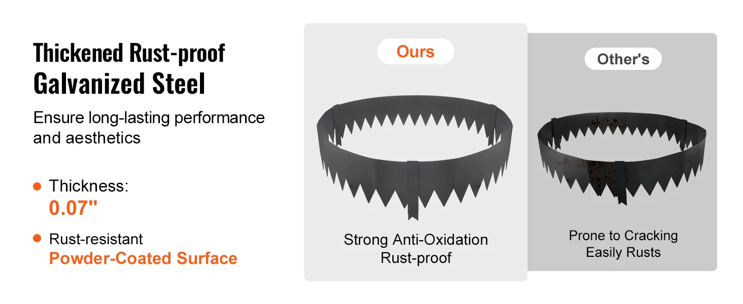 Rust and Corrosion Resistant: Crafted from 0.07" thick galvanized steel with a powder-coated surface, our rust-proof landscape edging is built to withstand outdoor elements. It is not easy to fade, or crack, ensuring long-lasting durability.