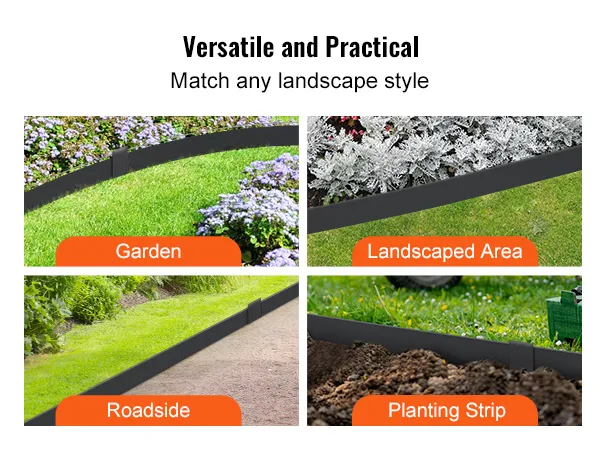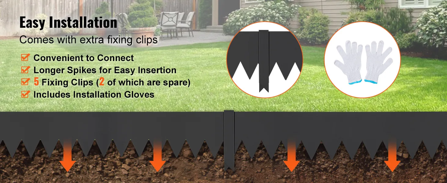 Various Sizes: VEVOR steel landscape edging is available in a set of 3 pieces, each measuring 40x8 inch. It comes with 5 clips for effortless installation. The extended spikes make secure ground anchoring, allowing you to create clean lines and spaces in your lawn. Loved by gardening enthusiasts.