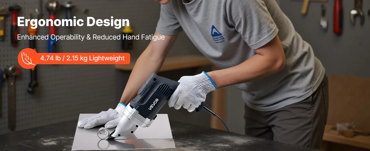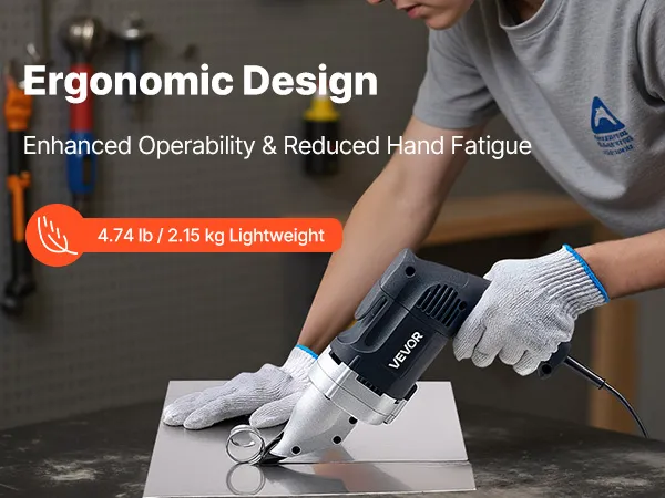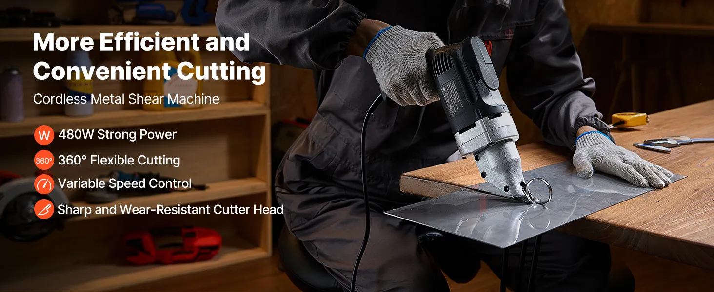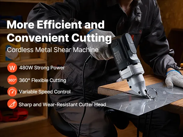 Efficiënt metaal snijden: Deze elektrische metaalschaar beschikt over een instelbare snijsnelheid van 15.000 tot 18.000 tpm en een krachtige 480W motor, wat keer op keer zorgt voor soepele en efficiënte sneden. Hij verwerkt moeiteloos diverse soorten metaalplaten met precisie.