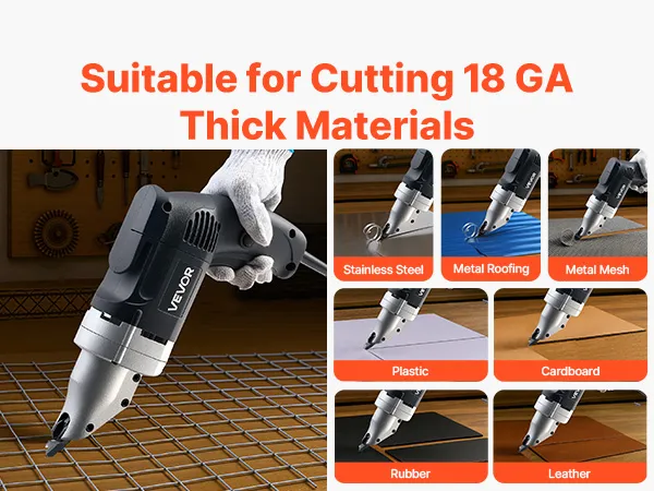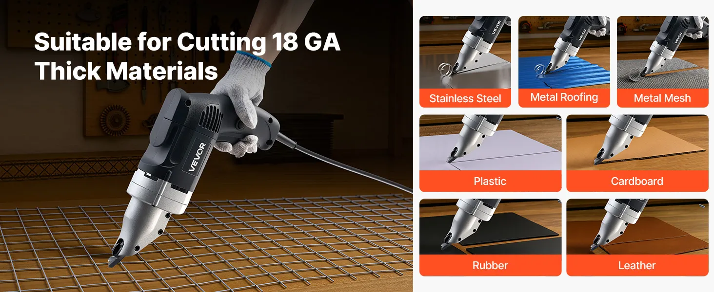 Deze elektrische schaar is geschikt voor een breed scala aan materialen en knipt gemakkelijk plaatwerk, plastic, karton, rubber en leer. Dankzij hun veelzijdigheid voldoen ze aan de meest uiteenlopende projectbehoeften in werkplaatsen, garages en rondom het huis.