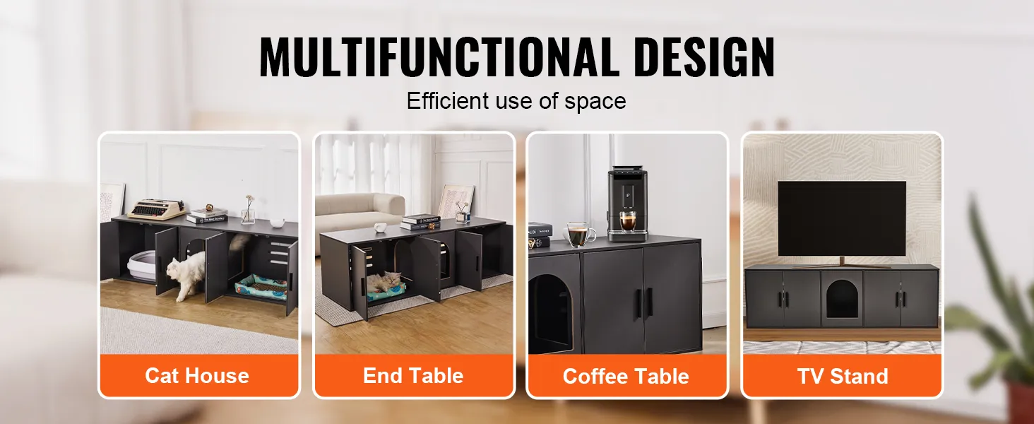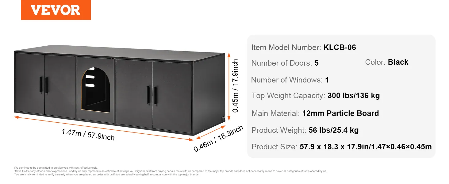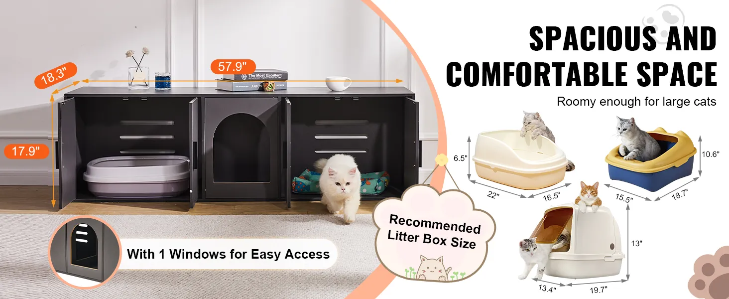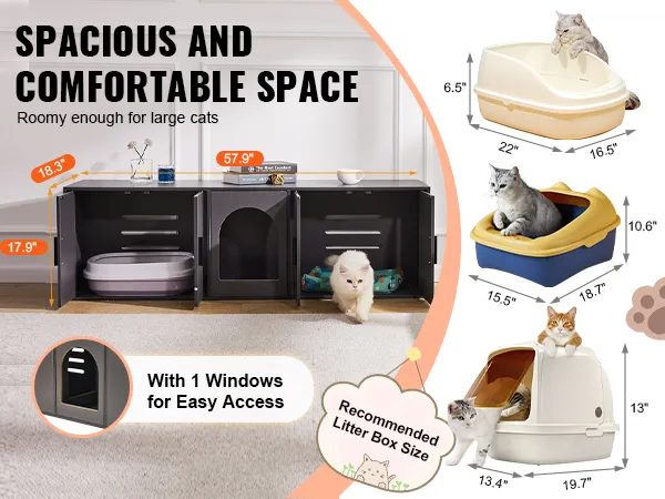 Spacious Space: Measuring 57.9x18.3x17.9in, this cat litter box furniture provides a comfortable and free resting space for pets. It can accommodate cat litter boxes with a length of less than 21.9" and a width of less than 17.7". It is equipped with 5 doors and a window, connecting two cabinets for cats to access freely.