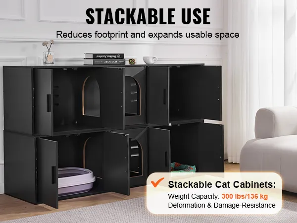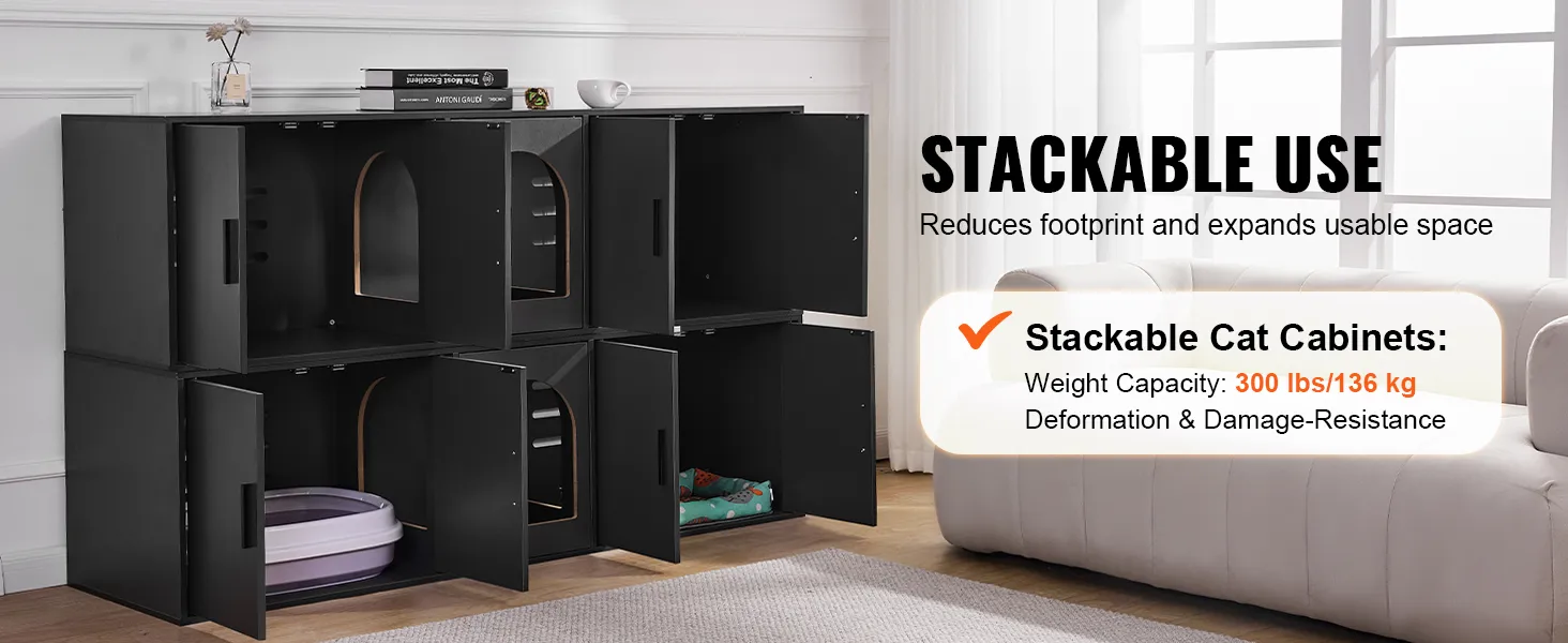 With a weight capacity of 300lb/136kg, the cat litter cabinet is stackable, making full use of the vertical space. The sturdy structure ensures deform-resistance over time, creating an efficient and tidy living environment.