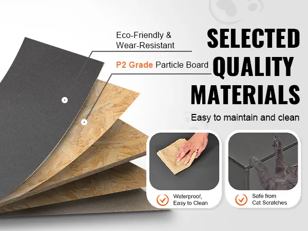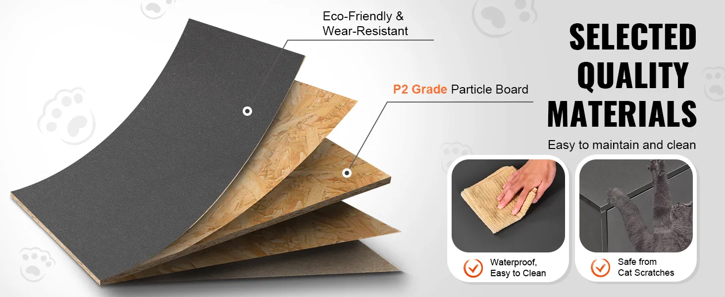 Made of P2 grade particle board, it is durable, ensuring the health of you and your pets. The high-quality finish is waterproof, and not easy to be damaged by cat scratching. Even cat urine or other stains can be easily wiped clean, greatly simplifying daily maintenance.