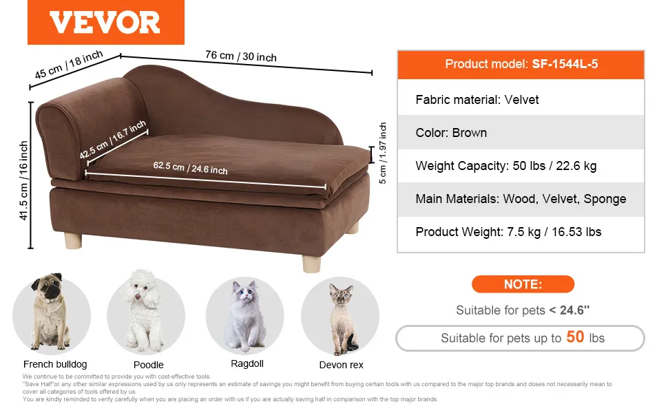 De VEVOR hondenbank heeft een afmeting van 30 x 18 x 16 inch. Hij is ideaal voor honden van verschillende groottes. Van kleine chihuahua's tot grote golden retrievers, deze bank past bij iedereen. Dit omvat het sterke houten frame en de zachte stof, waardoor hij duurzaam is. Is hij geschikt voor huizen met veel huisdieren? Ja, de bank kan tot 81 lbs dragen. Hij is dus perfect voor rassen zoals labradors en poedels. Uw huisdieren zullen dol zijn op het ruime ontwerp. Hij is ideaal voor huisdieren die meer ruimte nodig hebben om zich uit te strekken. Deze huisdierenbank voldoet aan de behoeften van verschillende rassen. Uw huisdieren zullen zich comfortabel voelen in deze huisdiervriendelijke ruimte.