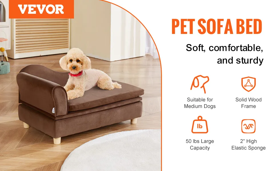 Het middelgrote hondenbed VEVOR heeft een zacht fluwelen oppervlak. Dit oppervlak is krasbestendig. Het is ook gemakkelijk schoon te maken. Het vereist dus minder schoonmaakwerk van u. De binnenkant is gevuld met sponzen met een hoge dichtheid. Deze sponzen ondersteunen de gewrichten van uw huisdier. Ze helpen ook hun gezondheid te beschermen. Het sterke houten frame zorgt voor duurzaamheid. Deze bank is gebouwd om lang mee te gaan. Hij kan de slijtage van dagelijks gebruik aan. Of uw hond nu speels of kalm is, deze bank zal het overleven. Het materiaal is ontworpen voor langdurig gebruik; deze bank biedt comfort en eenvoudig onderhoud.